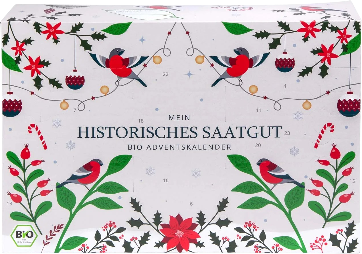 In diesem Adventskalender verbergen sich 24 unterschiedliche, historische Gemüsesorten und Kräuter in Bio-Qualität. Damit ist es ein ideales Starter-Set mit vergessenen Gemüse- und Kräuterpflanzen. Perfekt für alle, die Wert auf Umwelt-, Artenschutz und natürlichen Geschmack legen.
