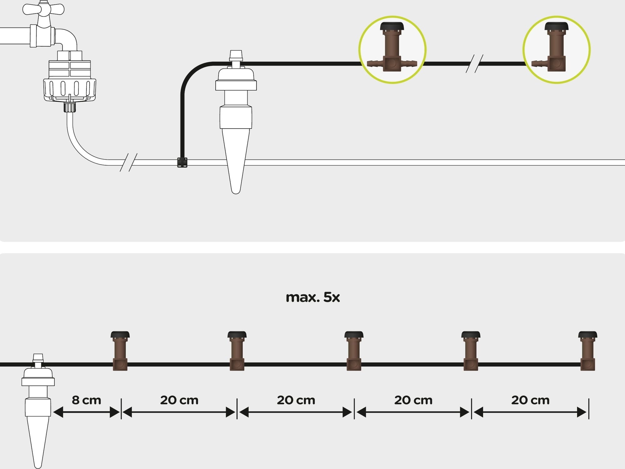 - Pedaços de mangueira com cerca de 20 cm de comprimento podem ser ligados a um máximo de 5 gotejadores de distribuição.