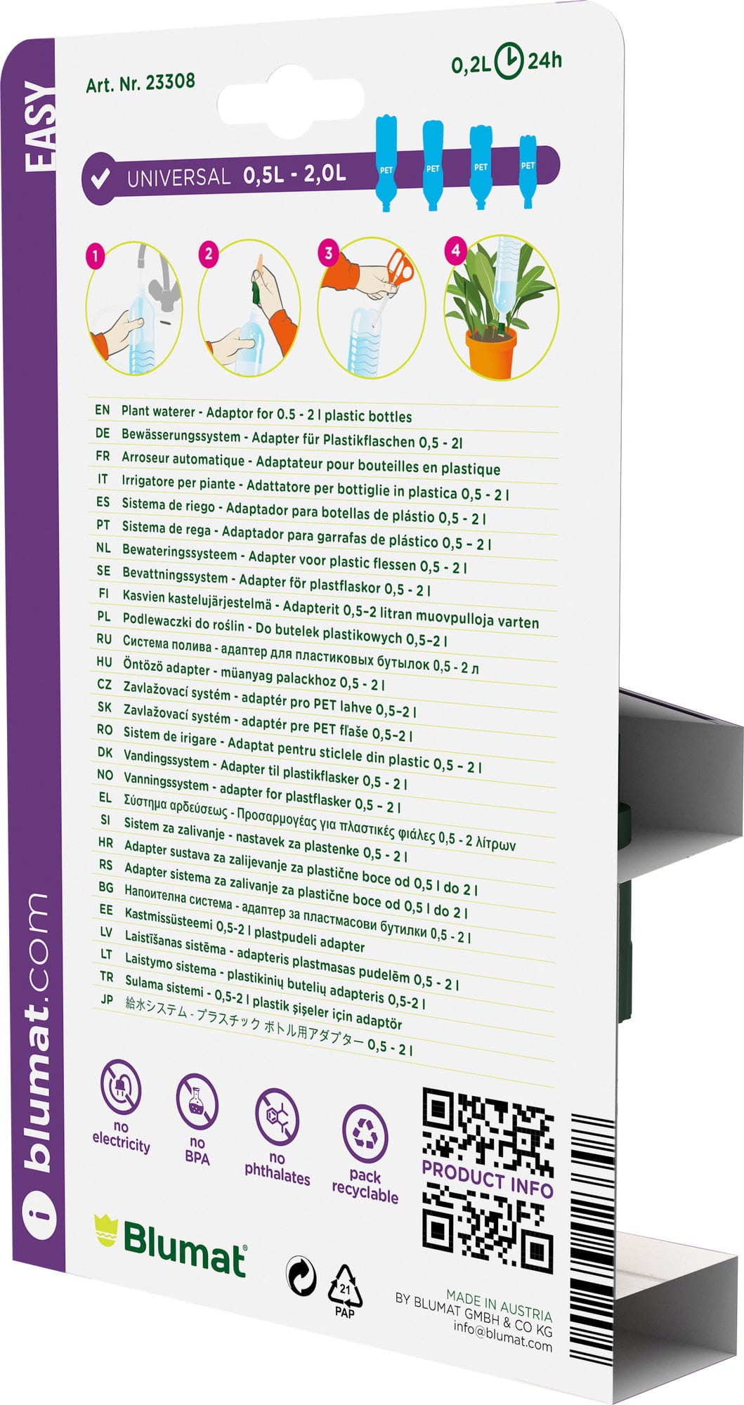 Com o Blumat Easy, as suas plantas em casa, na varanda ou no jardim são abastecidas com água de forma contínua e uniforme. Este sistema de irrigação simples, mas muito eficaz, pode ser utilizado com quase todas as garrafas de plástico comuns.