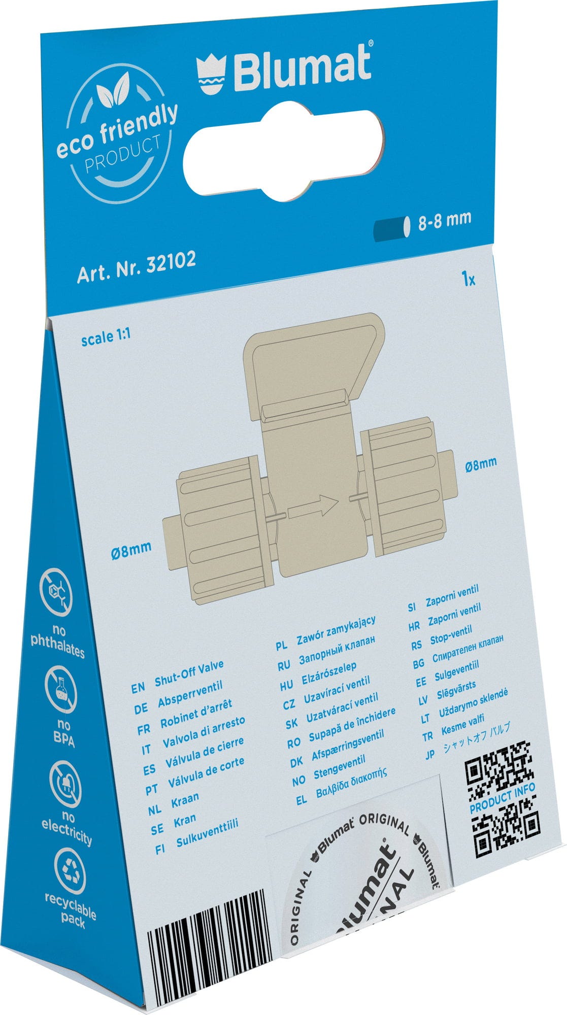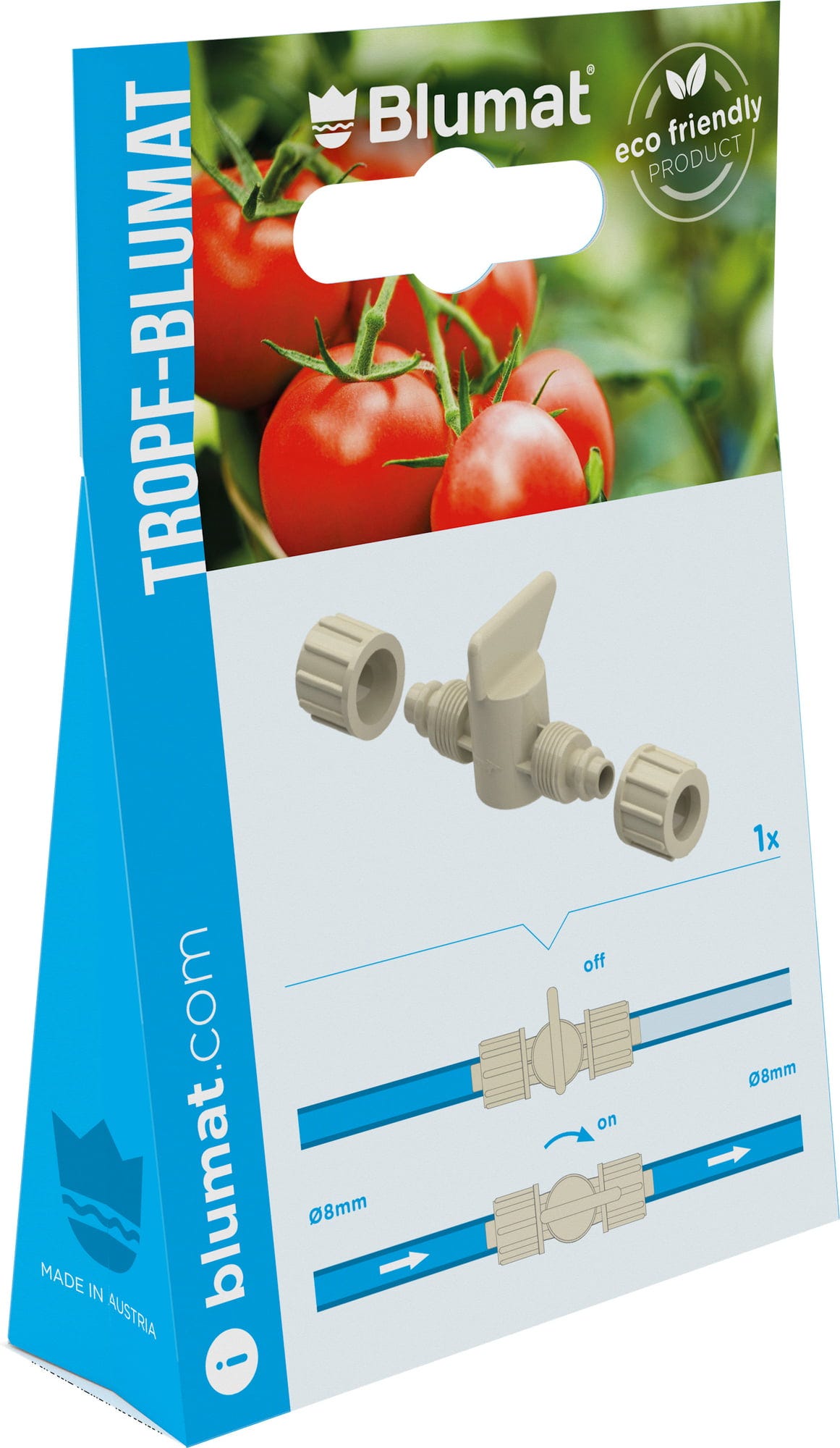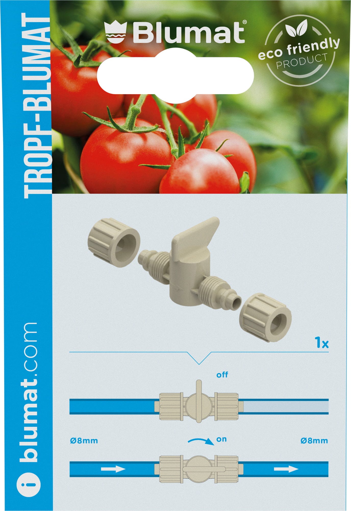 A válvula de corte da Blumat bloqueia o fluxo de água da linha lateral, por exemplo, quando a época de rega começa mais tarde ou termina mais cedo. A instalação é rápida e descomplicada, mesmo em sistemas já existentes.
