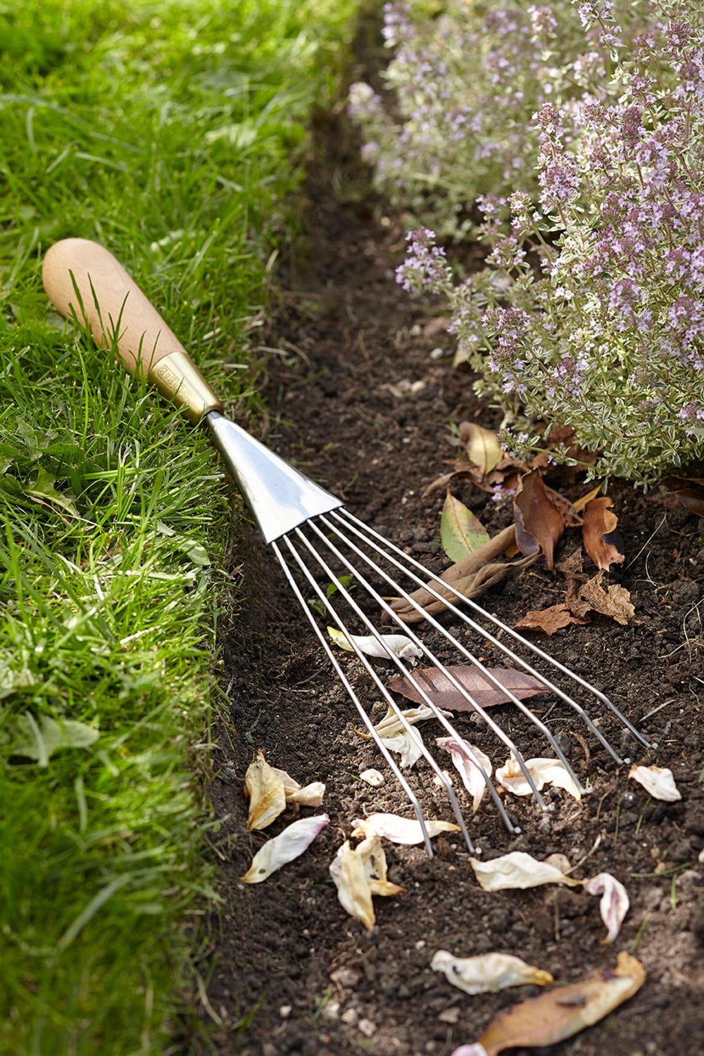 Este Ancinho de Mão, com as suas Dimensões Compactas, é perfeito para removeres folhas entre e ao redor das tuas Plantas. O fabrico de alta qualidade em Aço Inoxidável robusto e Madeira de Faia com certificação FSC® garante um Manuseamento excecional, bem como uma Vida Útil particularmente longa para esta Ferramenta. Graças às pontas curvadas para cima, os Rebentos Jovens e delicados não são danificados. Além disso, as folhas dificilmente ficam presas no Ancinho, podendo ser reunidas num só lugar.