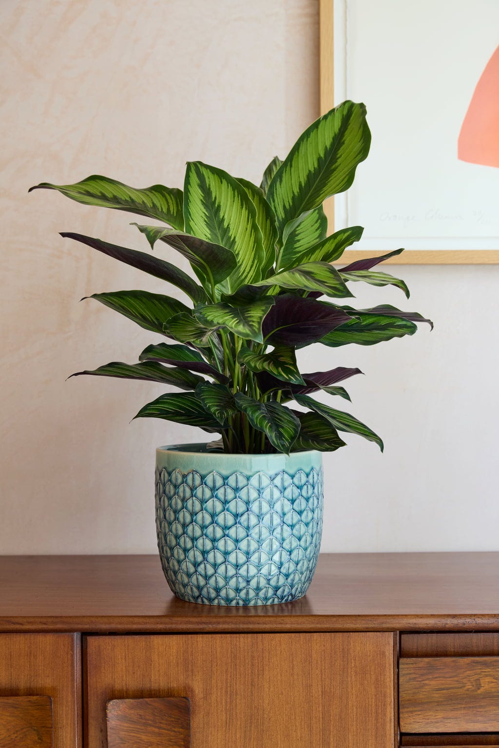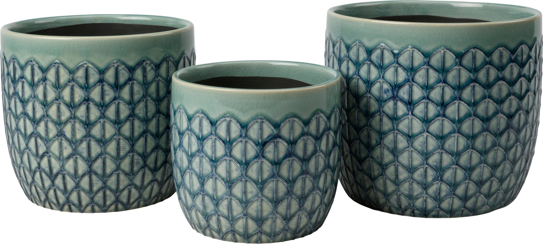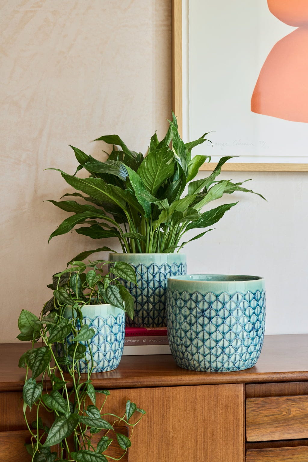Dá à tua Casa um toque elegante e moderno com este Vaso para Plantas de Interior com design artístico. O Padrão em relevo é realçado de forma elegante por uma lavagem de cor Azul Profundo. Um Vidrado Craquelé subtil num deslumbrante Verde/Azul Celadon confere profundidade adicional ao design e torna este Vaso num verdadeiro destaque visual.