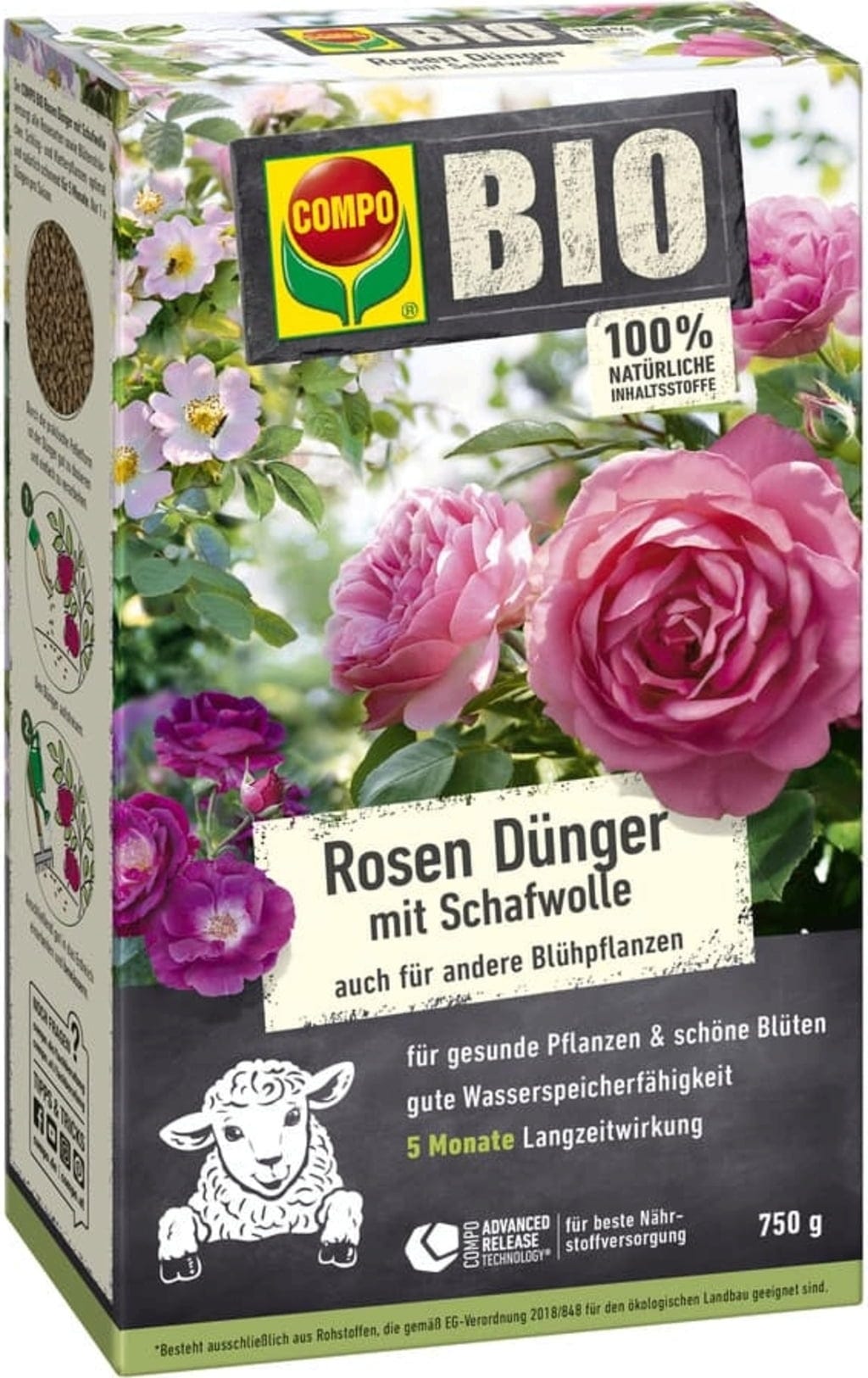 O fertilizante para rosas com lã de ovelha da linha BIO da Compo é um fertilizante puramente orgânico de libertação lenta para todas as variedades de rosas, arbustos floridos e plantas trepadeiras. Graças à lã de ovelha natural, os nutrientes são libertados lentamente no solo durante um longo período, até cinco meses, enquanto o solo é arejado e tem uma melhor estrutura. Isto permite que as rosas beneficiem de um crescimento vigoroso, de uma floração mais intensa e de uma regeneração resistente, tudo isto sem necessidade de fertilização contínua.