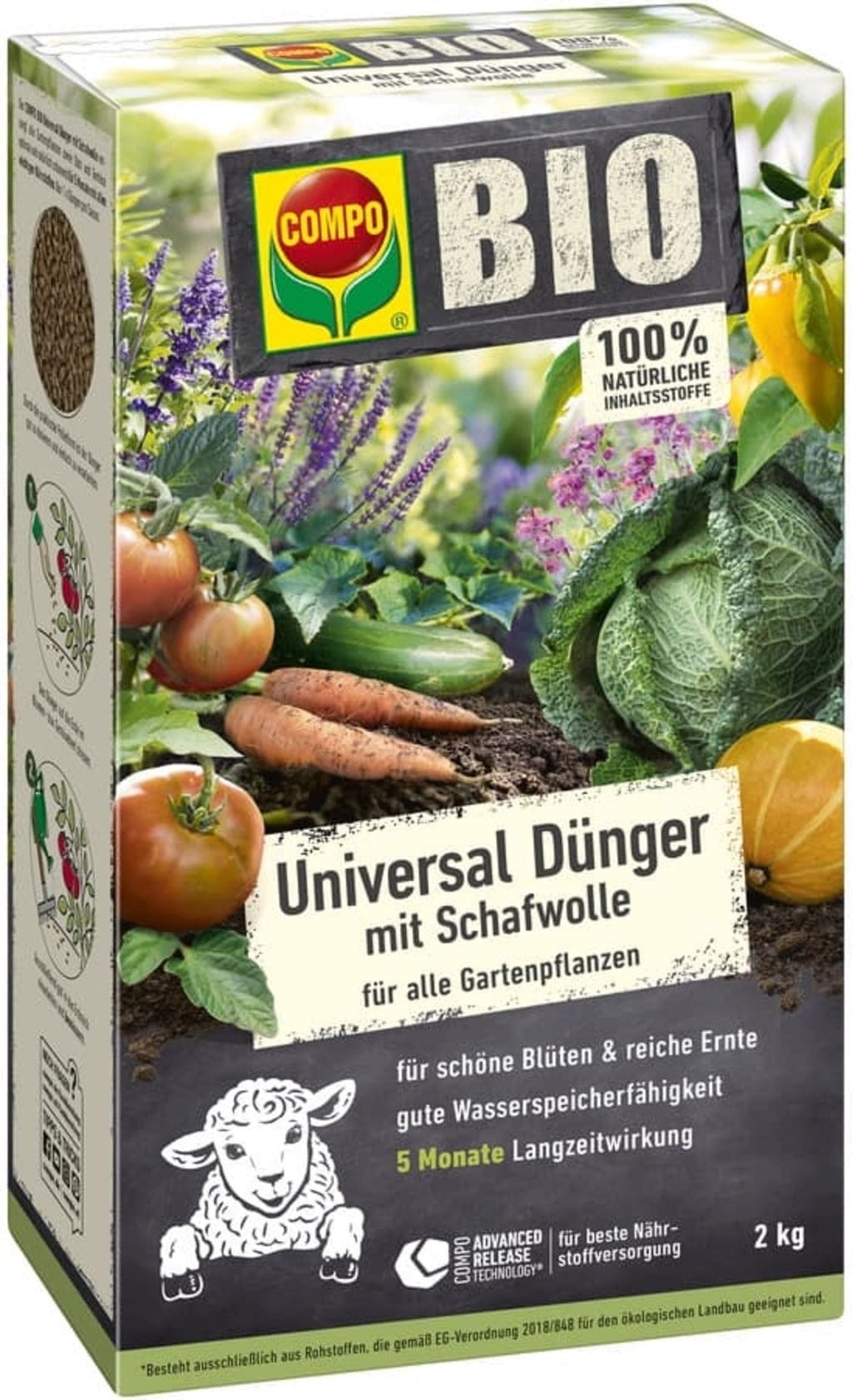 O fertilizante universal com lã de ovelha da linha BIO da Compo é um fertilizante puramente orgânico, de libertação lenta, para todas as plantas de jardim, frutas e legumes. Graças à lã de ovelha natural, não só os nutrientes são continuamente libertados durante um período de até cinco meses, como também a água é excecionalmente bem retida. Isto garante um solo macio e vital e apoia as plantas de forma fiável, mesmo em verões quentes e secos.