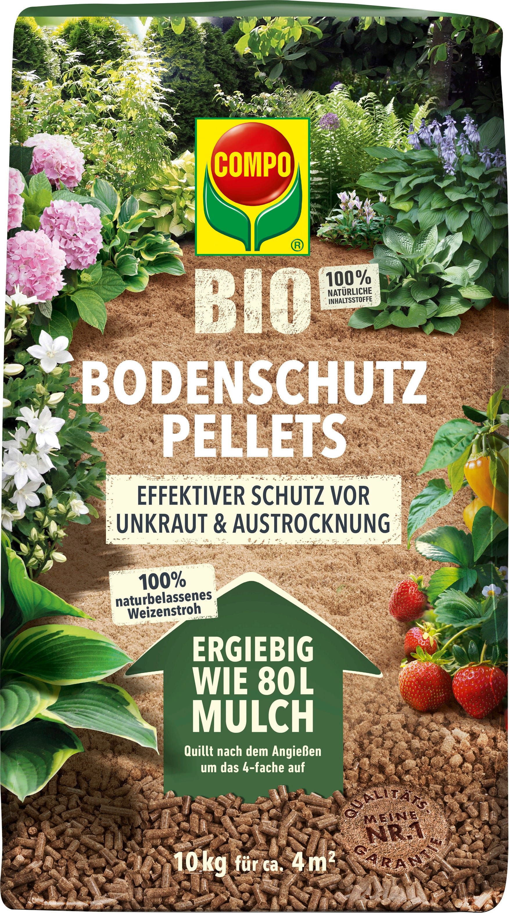 Os pellets biológicos de proteção do solo da COMPO BIO oferecem uma solução prática e ecológica para canteiros de jardim. Após a rega, os pellets incham e formam uma camada de cobertura contínua que protege as plantas da desidratação, do gelo e da radiação UV. A camada de cobertura inibe as ervas daninhas, limita o consumo de água e proporciona um aspeto visual atraente ao canteiro – ideal para legumes, fruta, flores ou culturas sensíveis.