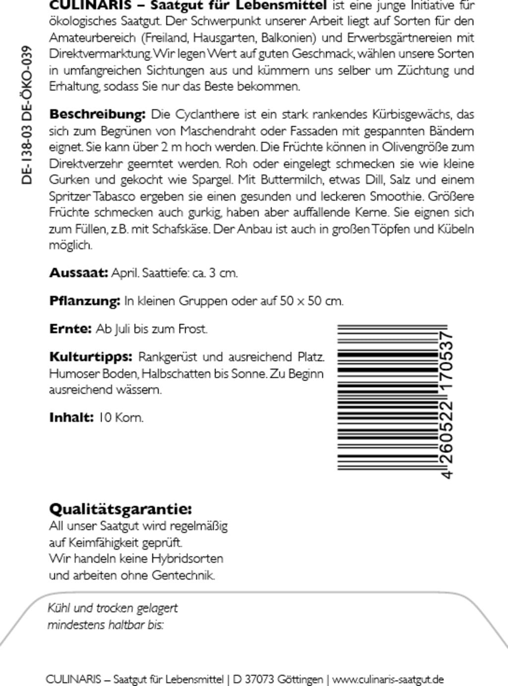 | Fabricante: | Culinaris - Saatgut für Lebensmittel, Thiegasse 5, 37124, Rosdorf, Alemanha, info@culinaris-saatgut.de, culinaris-saatgut.de |