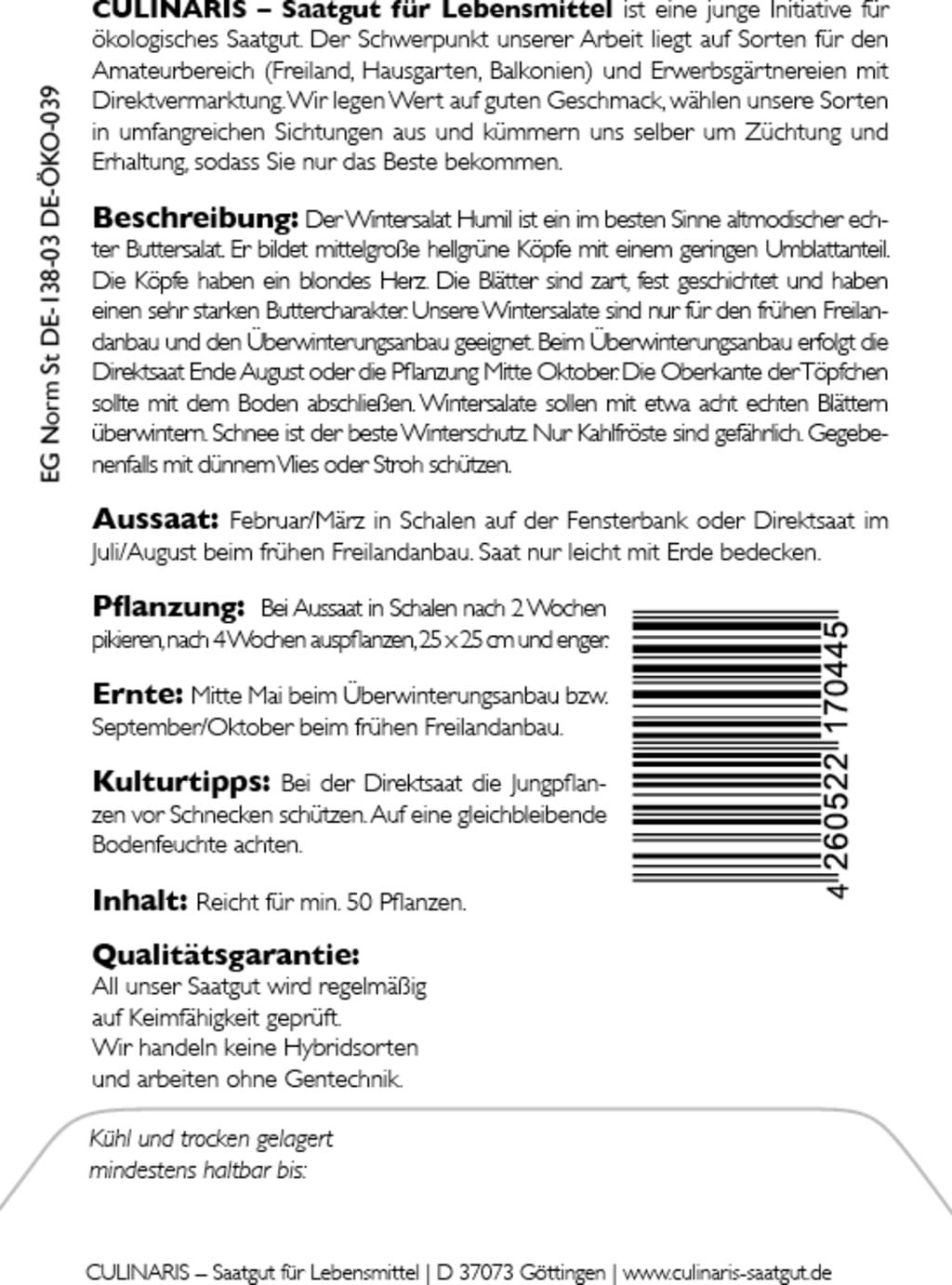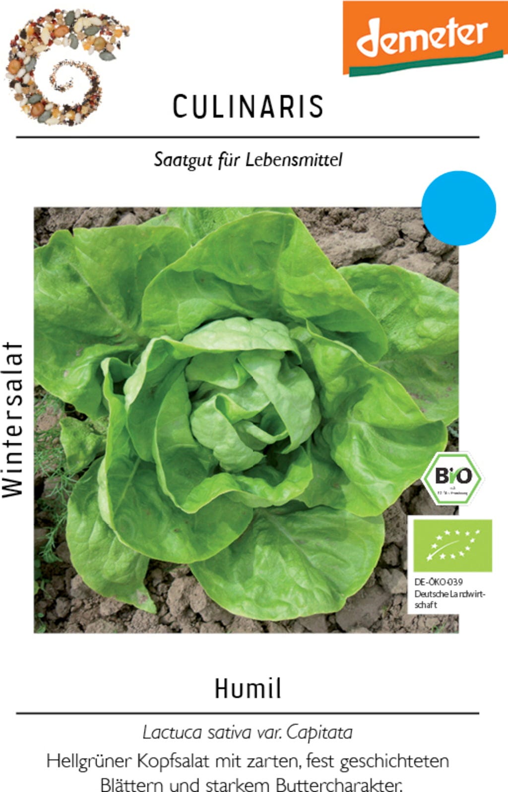 A Alface de Inverno Bio "Humil" é uma variedade verdadeira de alface-manteiga com cabeças atraentes de cor verde-claro e folhas tenras com um caráter de manteiga invulgarmente intenso. É adequada apenas para o cultivo precoce ao ar livre, bem como para o cultivo de inverno.