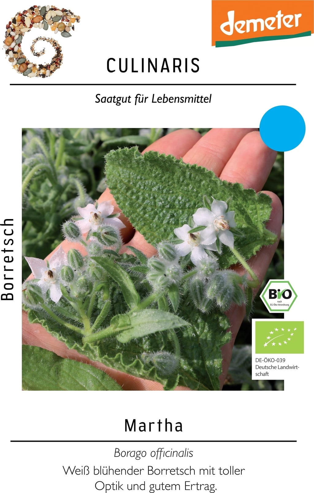 A Borragem Branca Bio "Martha" é considerada uma erva aromática e decorativa muito pouco exigente, que dá um toque especial, por exemplo, a saladas de pepino ou sanduíches. A borragem branca é menos comum do que a sua variante azul, mas não é de todo menos atraente. Toda a planta pode ser consumida. Ao picar finamente, a textura ligeiramente áspera da planta pode ser minimizada. Uma poda regular estimula o crescimento de novos rebentos verdes.