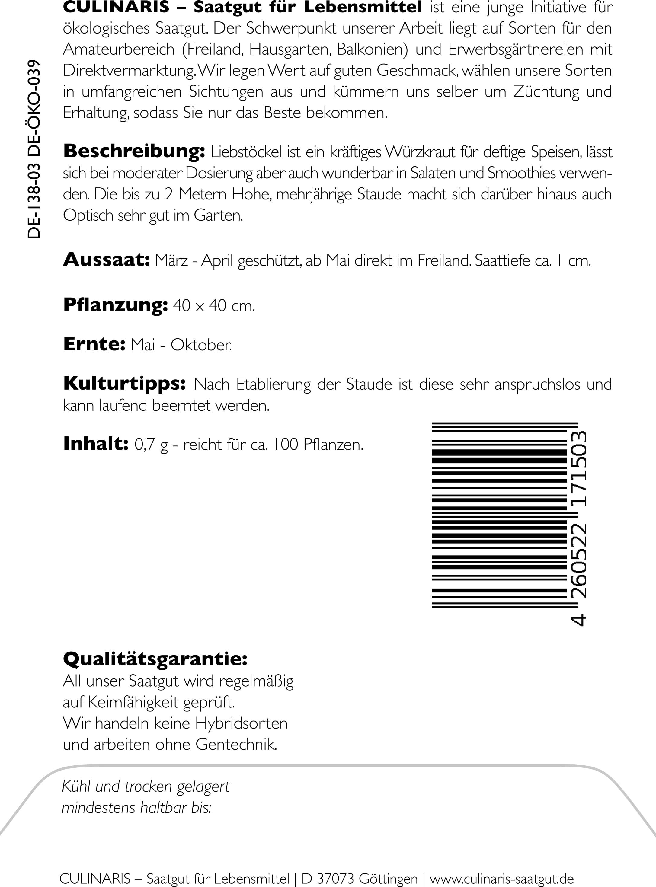 | Fabricante: | Culinaris - Saatgut für Lebensmittel, Thiegasse 5, 37124, Rosdorf, Alemanha, info@culinaris-saatgut.de, culinaris-saatgut.de |