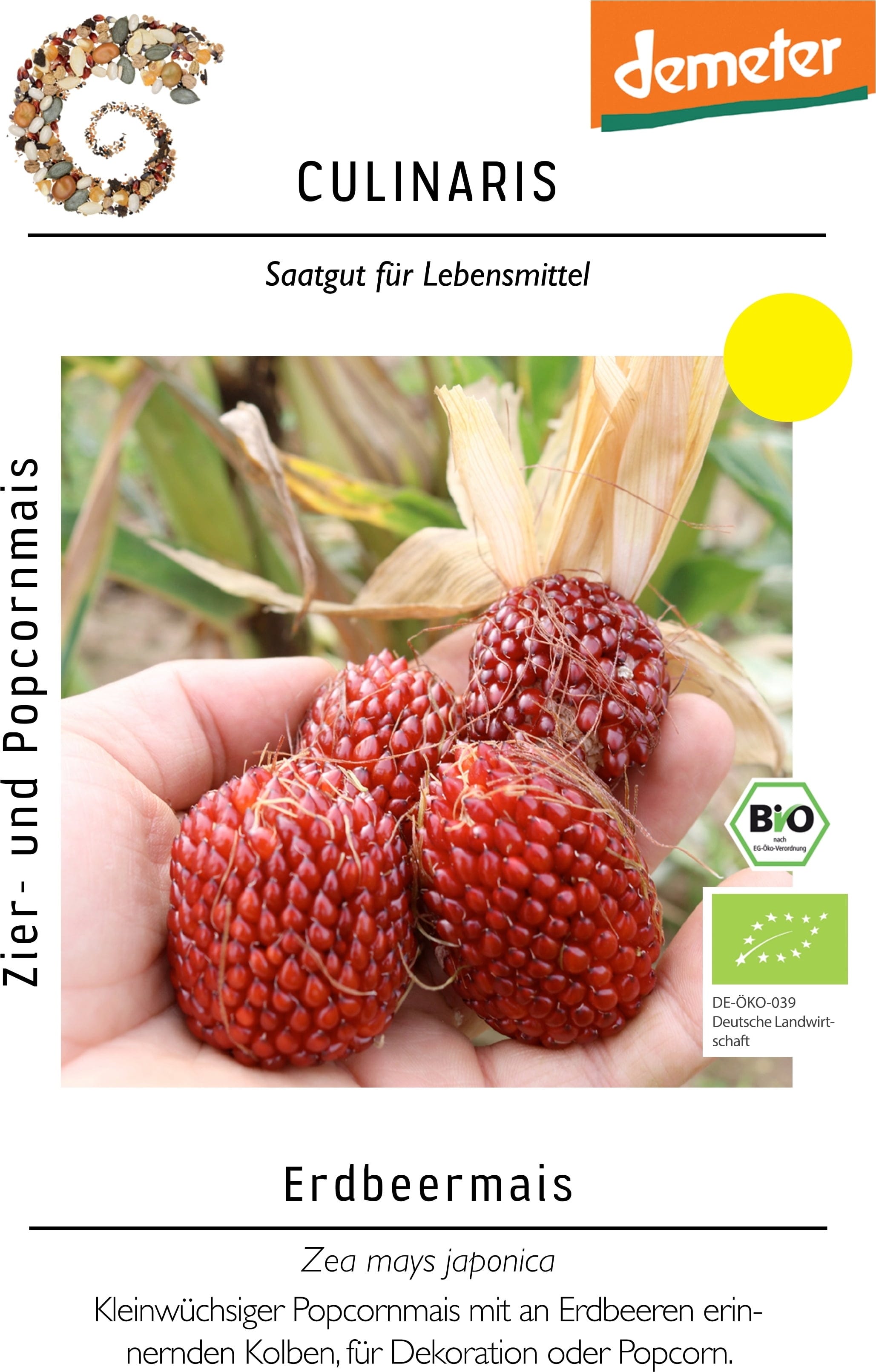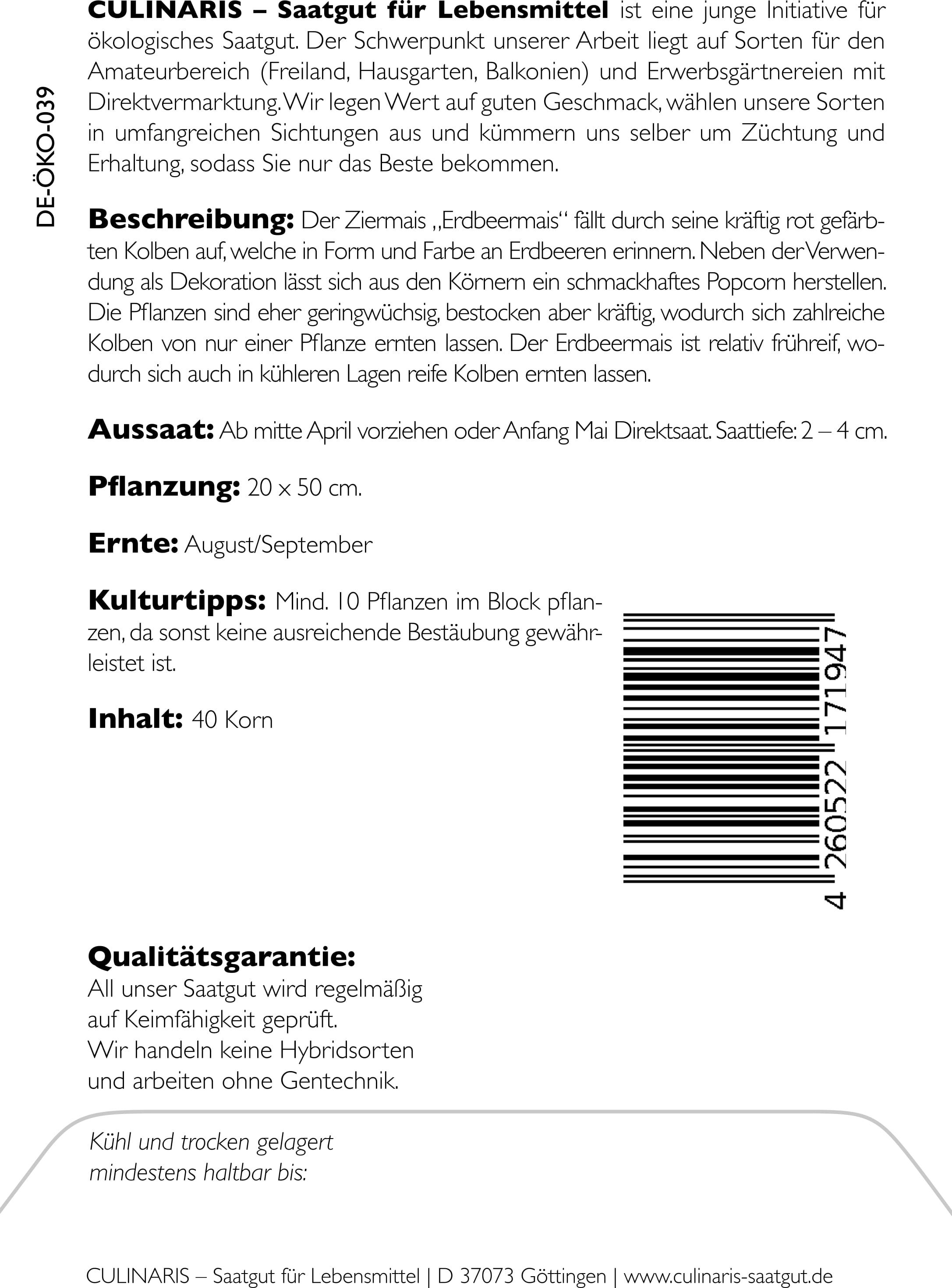 O milho ornamental e de pipoca 'Erdbeermais' é um verdadeiro destaque no jardim. As suas pequenas espigas de cor vermelha brilhante assemelham-se visualmente a morangos, tornando-o a combinação perfeita entre planta útil e ornamental. Apesar da sua altura de crescimento compacta, destaca-se pelo seu perfilhamento vigoroso, permitindo a colheita de várias espigas por planta.