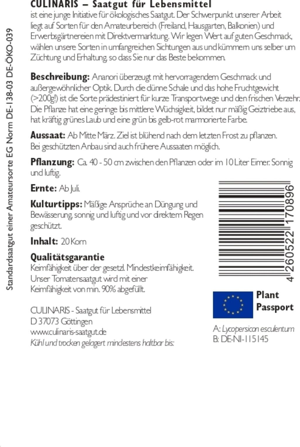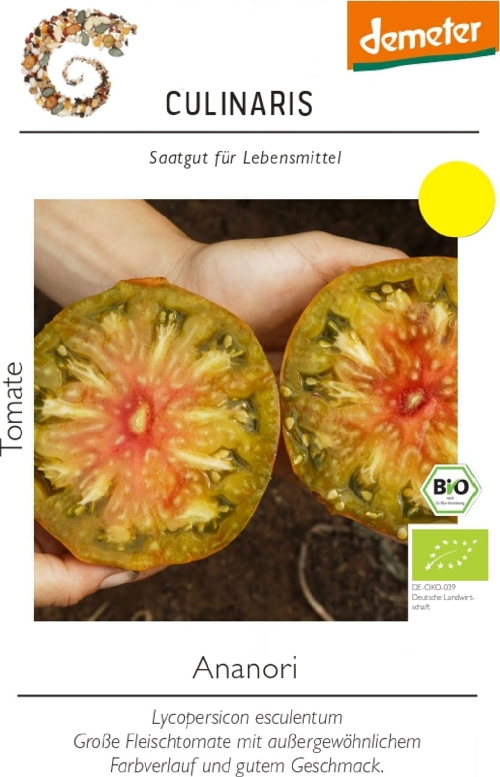 Tomate Bio "Ananori" é uma variedade antiga produz frutos muito grandes com casca fina e um sabor excelente. São ligeiramente canelados e achatados, com uma cor marmoreada de verde a amarelo – um verdadeiro destaque na horta, ideal para consumo em fresco.