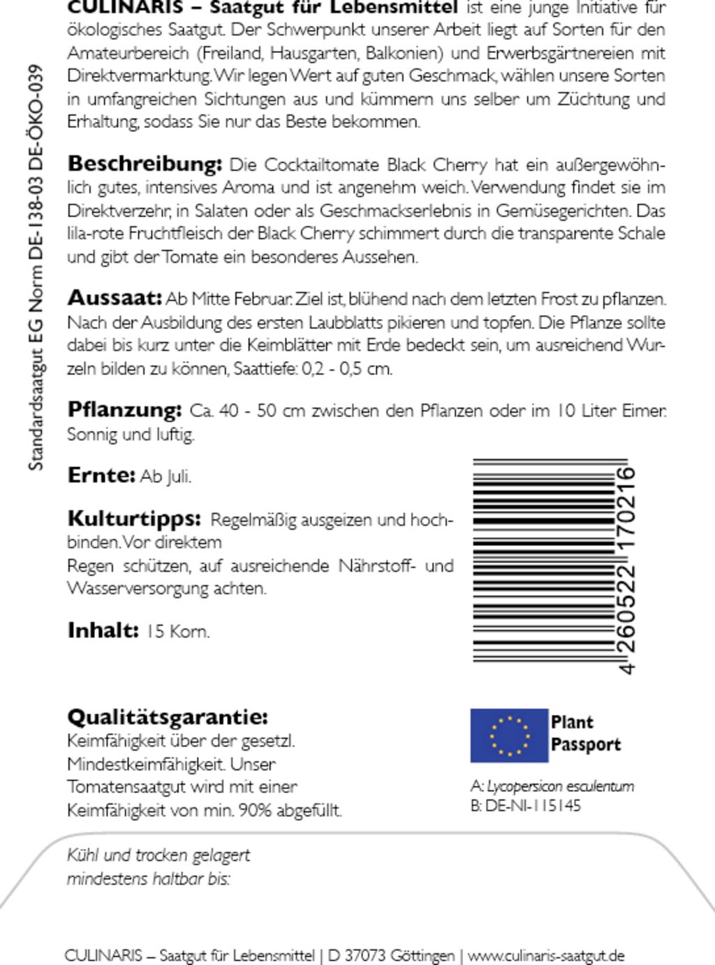 | Fabricante: | Culinaris - Saatgut für Lebensmittel, Thiegasse 5, 37124, Rosdorf, Alemanha, info@culinaris-saatgut.de, culinaris-saatgut.de |