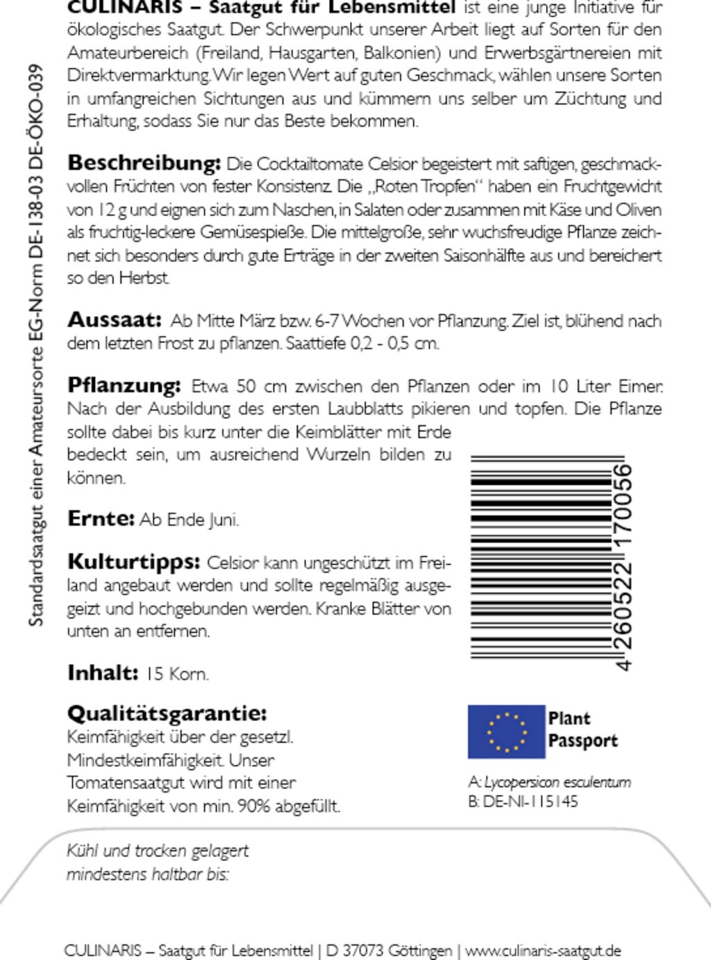 | Fabricante: | Culinaris - Saatgut für Lebensmittel, Thiegasse 5, 37124, Rosdorf, Alemanha, info@culinaris-saatgut.de, culinaris-saatgut.de |