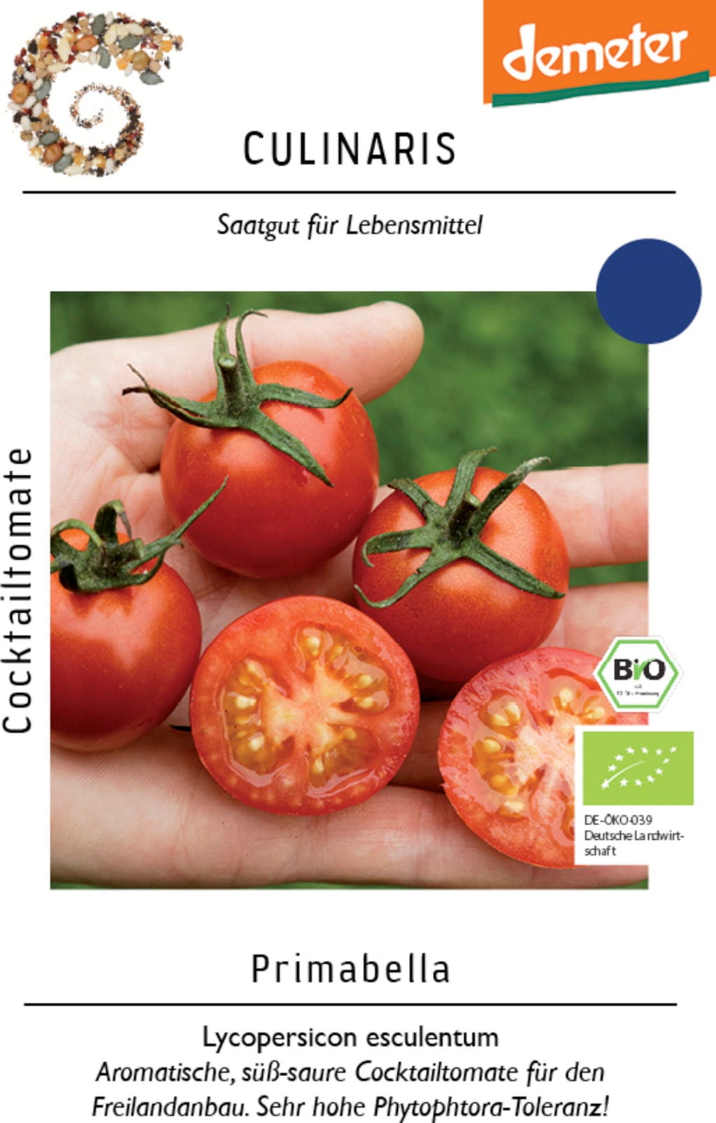 Tomate Cocktail Bio "Primabella" é uma variedade de ciclo médio-precoce e crescimento vigoroso produz uma grande quantidade de frutos vermelhos brilhantes pendurados em cachos, que são particularmente adequados para consumo fresco devido ao seu sabor agridoce e podem ser bem armazenados. A colheita é possível até à geada.