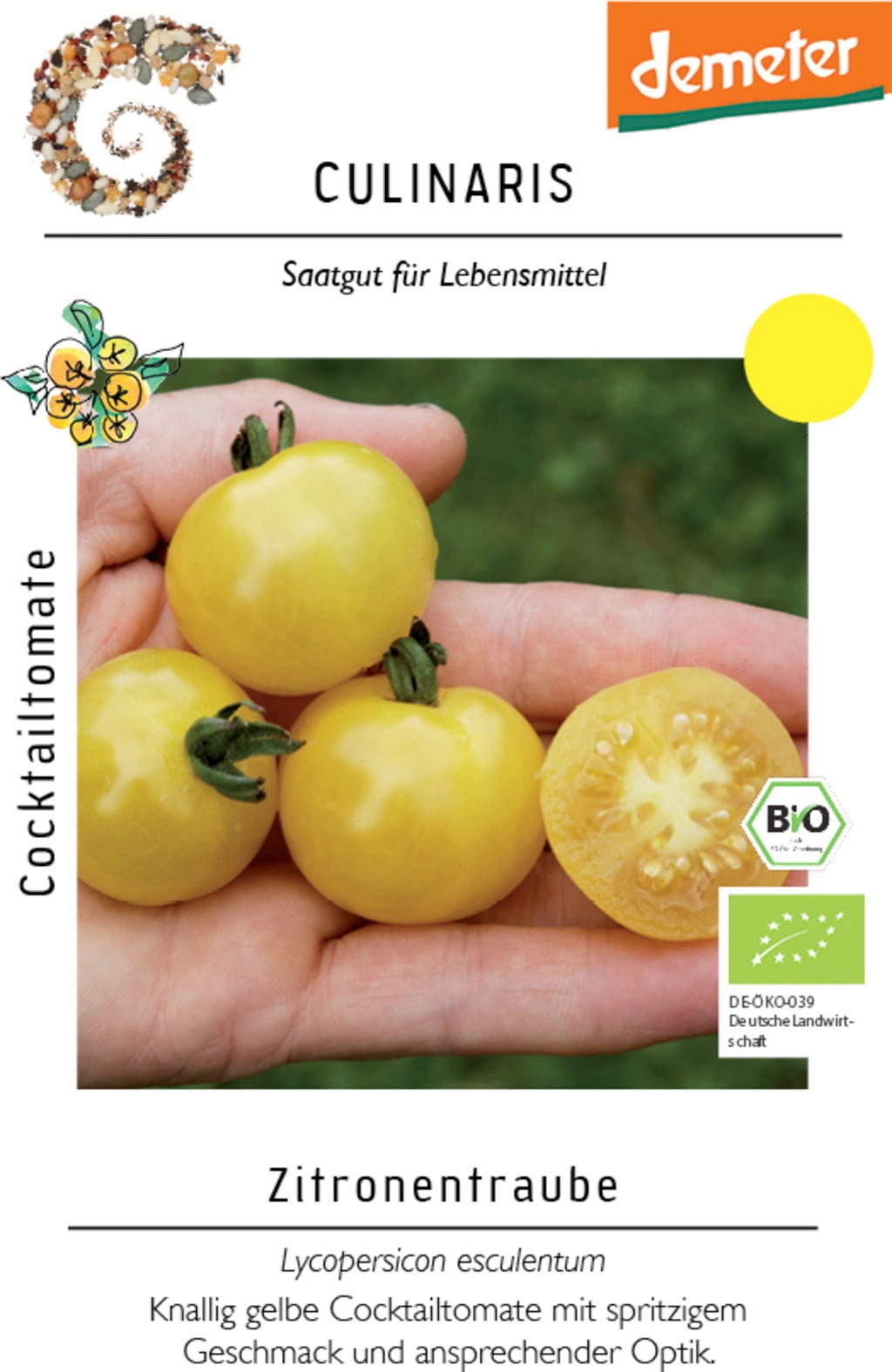Tomate-cocktail Bio "Zitronentraube" é uma planta produtiva e saudável produz uma grande quantidade de frutos redondos e achatados que lembram limões, não só na cor, mas também na fragrância das flores e no agradável sabor ácido. Os frutos ainda podem ser colhidos no outono.