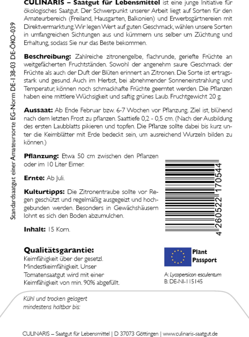 | Fabricante: | Culinaris - Saatgut für Lebensmittel, Thiegasse 5, 37124, Rosdorf, Alemanha, info@culinaris-saatgut.de, culinaris-saatgut.de |