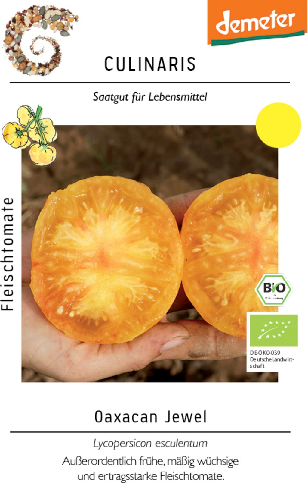 Oaxacan Jewel é um tomate coração de boi invulgarmente precoce, com um sabor suave e aromático. Os frutos brilham em belos tons de amarelo a vermelho e amadurecem de forma fiável após a colheita. A planta de crescimento moderado é ideal para pequenos canteiros ou vasos. Com alguma proteção contra a chuva, proporciona uma colheita abundante já a partir do final de junho.