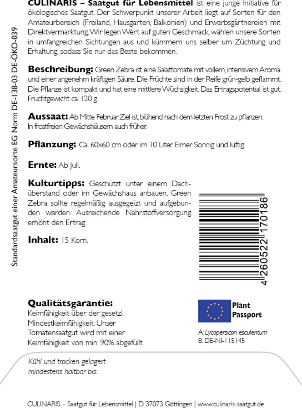 | Fabricante: | Culinaris - Saatgut für Lebensmittel, Thiegasse 5, 37124, Rosdorf, Alemanha, info@culinaris-saatgut.de, culinaris-saatgut.de |