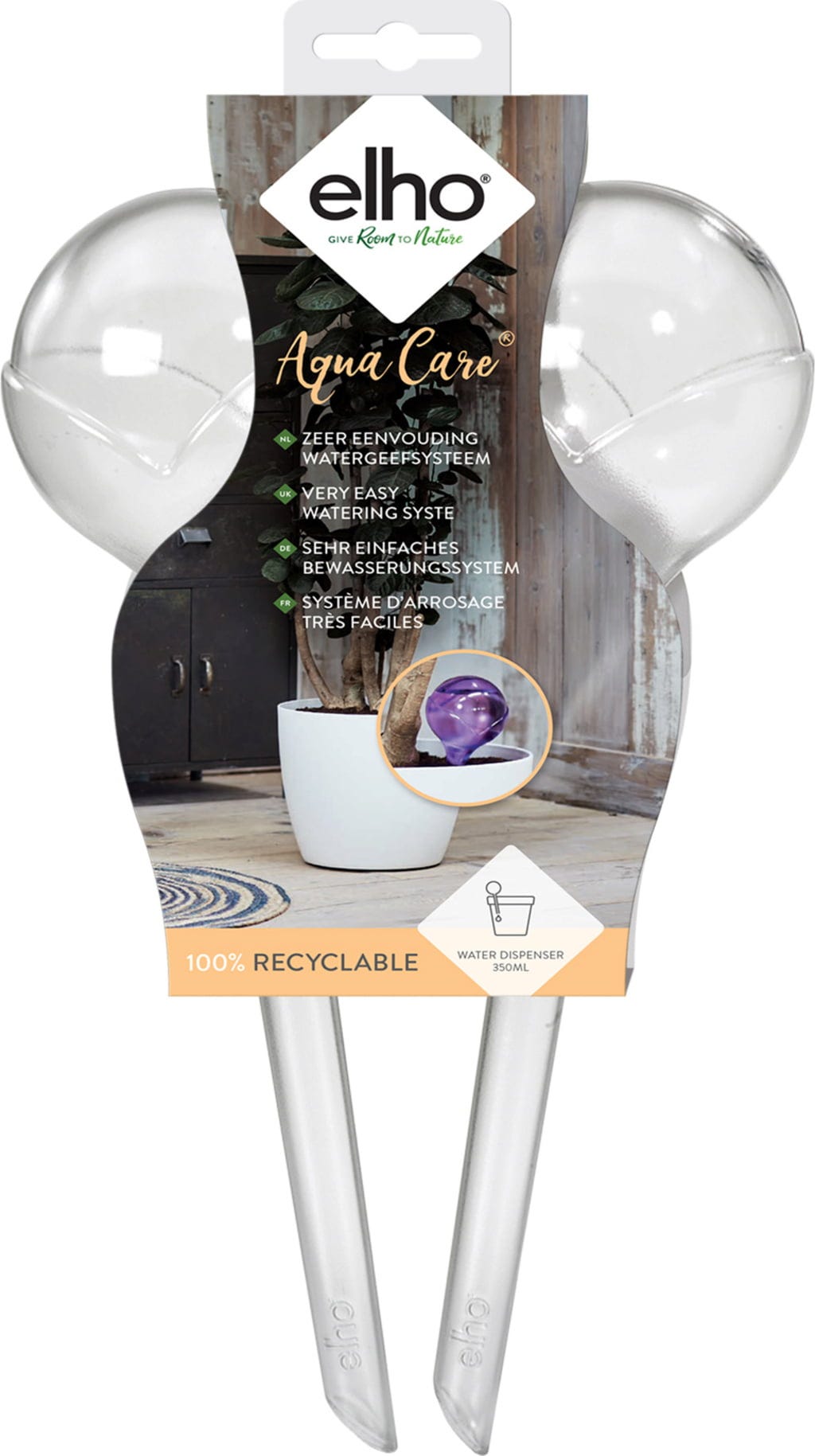 Este sistema de irrigação fácil de usar para as suas plantas é adequado para todos os vasos de flores com um diâmetro entre 14 e 50 cm. Basta encher a esfera com água e inseri-la na terra com uma ligeira inclinação. O Aqua Care liberta a quantidade certa de água assim que a planta fica com sede. Desta forma, o Aqua Care garante que as suas plantas recebam sempre a quantidade correta de água. Fabricado em material inquebrável.