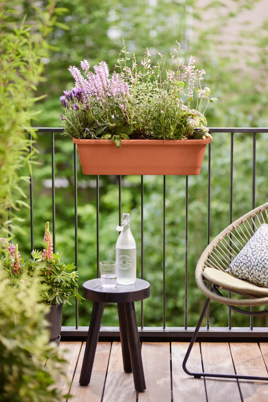Com a floreira de varanda Noa, estará bem equipado durante todo o ano. O material robusto é totalmente resistente às intempéries e, por isso, pode permanecer no exterior mesmo no inverno. Mas a Noa também convence nos meses de verão, pois no fundo esconde-se um grande reservatório de água que protege as suas plantas da desidratação. Mesmo que se esqueça de regar, as suas protegidas estarão sempre bem cuidadas.