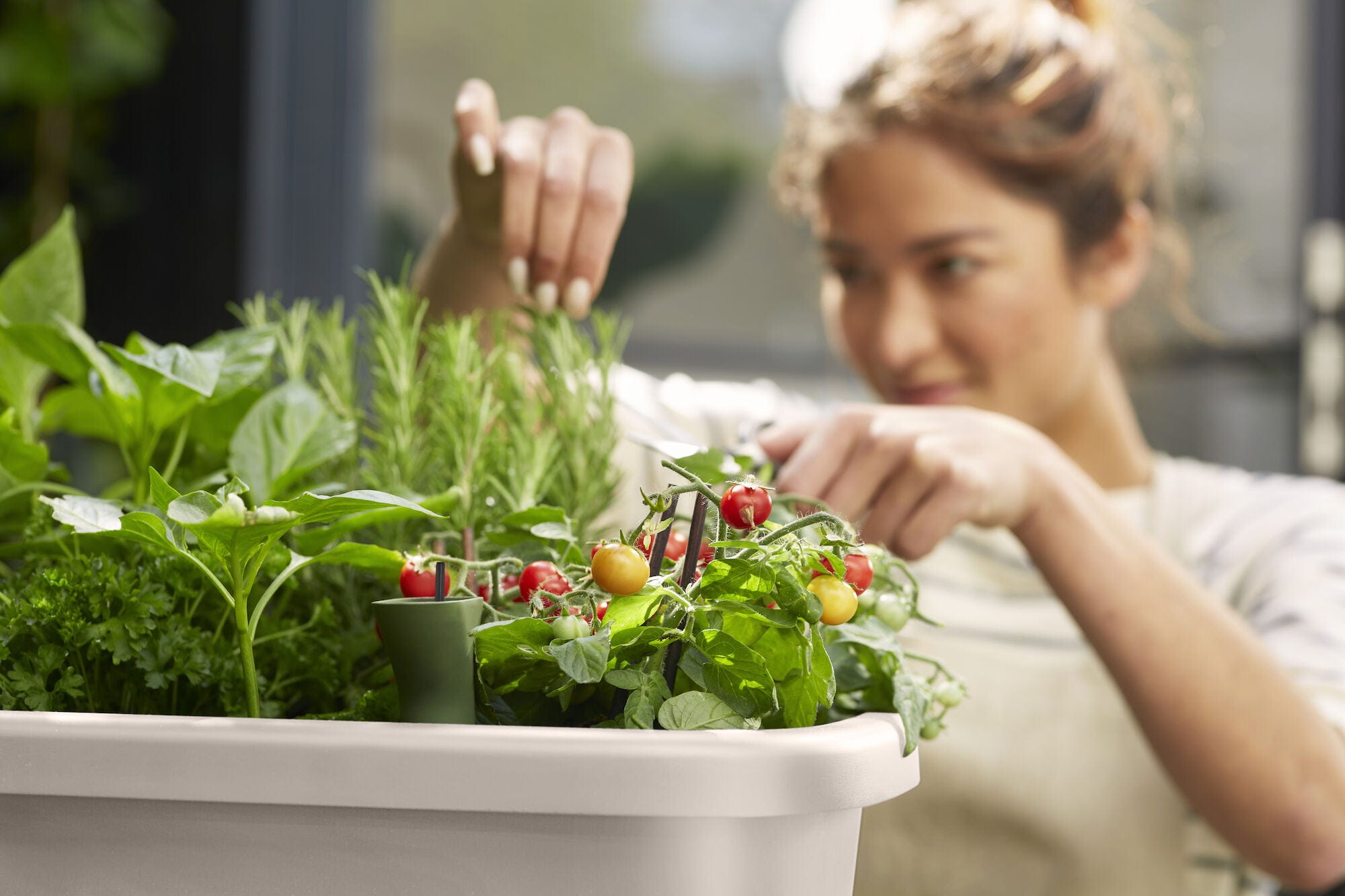 Com esta mesa prática, o cultivo das suas próprias plantas torna-se ainda mais divertido. A sua altura permite um trabalho confortável que protege as costas e oferece espaço suficiente para uma pequena horta de cozinha com tomates, manjericão e outras ervas aromáticas.