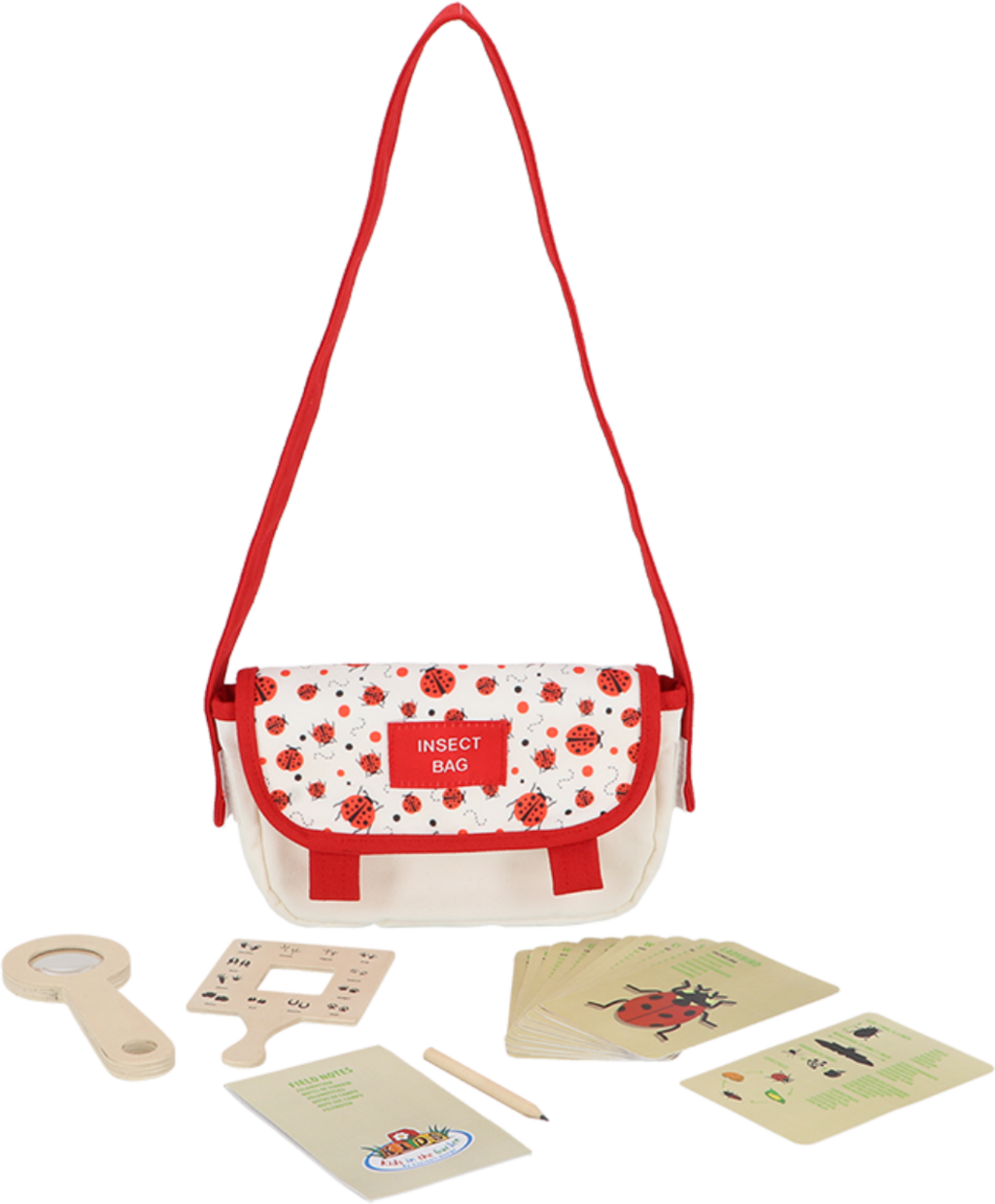 A bolsa de explorador para observação de insetos é o conjunto perfeito para pequenos naturalistas! O conjunto inclui uma bolsa prática, uma lupa de madeira, cartões informativos sobre várias espécies de insetos em vários idiomas e um bloco com caneta – tudo o que precisa para observações emocionantes! Por isso, pegue na sua bolsa de explorador e viva horas empolgantes na natureza.