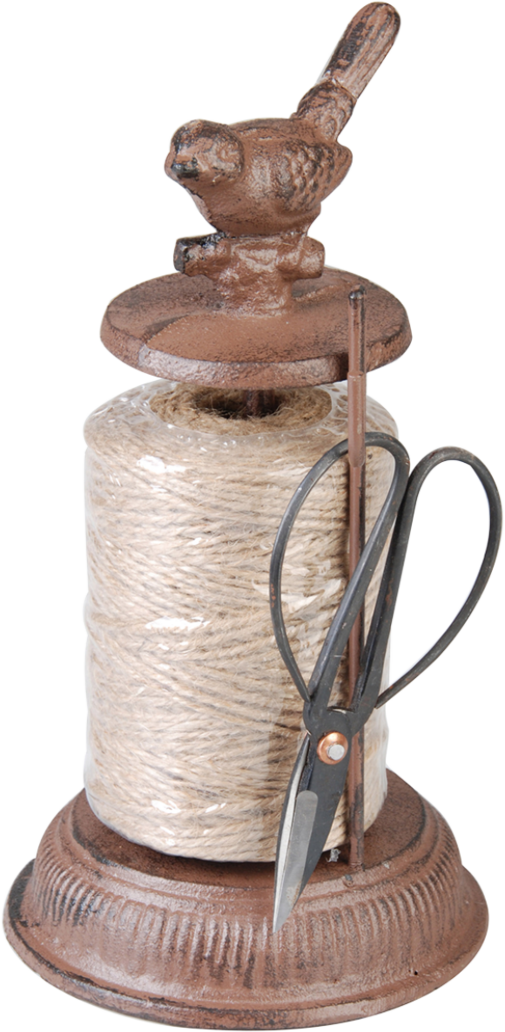 O dispensador de cordel em ferro fundido em castanho antigo é adornado por um pequeno pássaro e vem num conjunto, incluindo cordel de juta e tesoura. Este acessório decorativo é um verdadeiro destaque, tanto prática como visualmente, e é perfeito para quem não quer abdicar do estilo nos seus ajudantes diários.