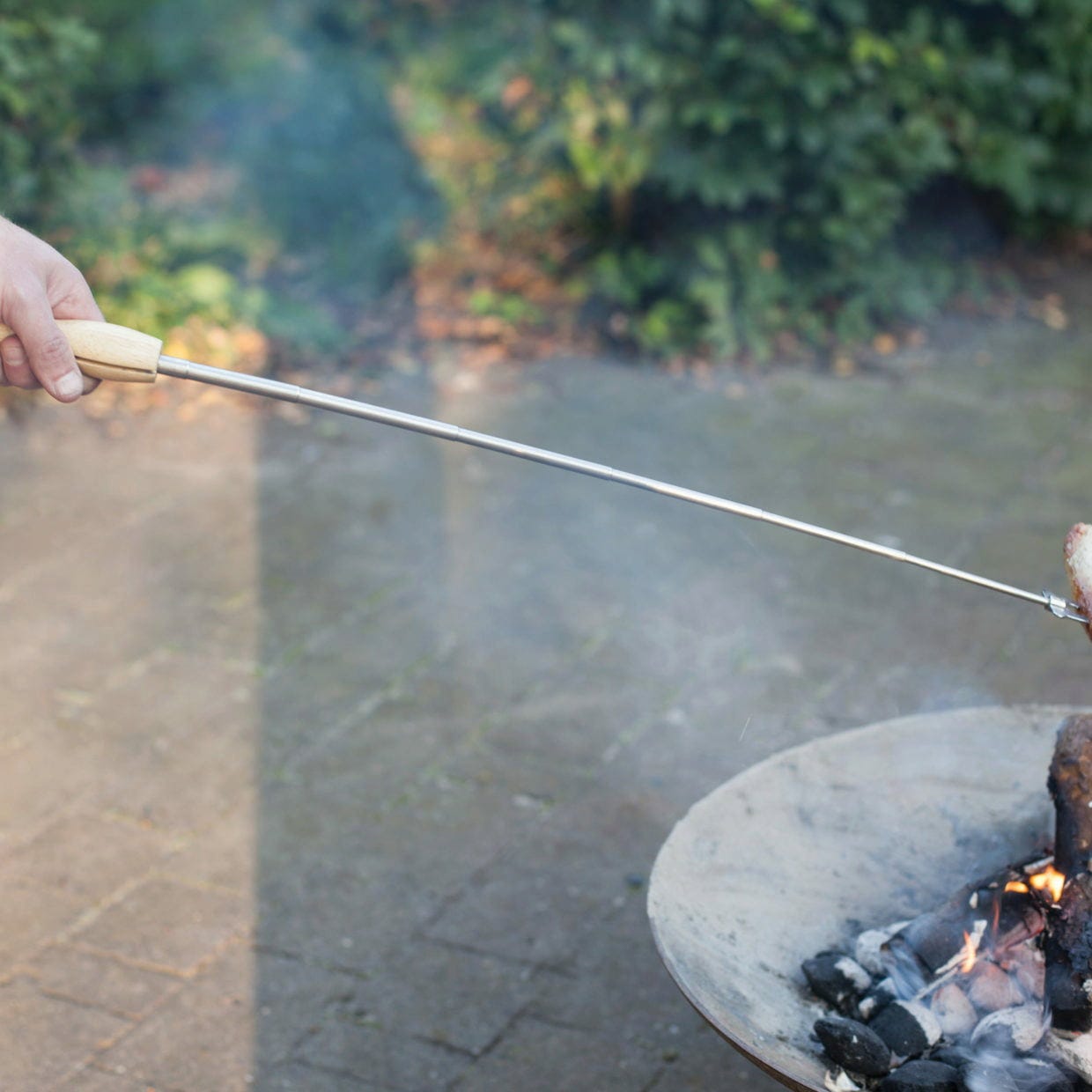 O que há de melhor do que grelhar salsichas, legumes ou pão sobre uma fogueira? Com o espeto de churrasco extensível, isto torna-se agora ainda mais fácil. A ponta dupla serrilhada segura os alimentos com firmeza, enquanto a haste longa garante uma distância segura do fogo. O espeto de churrasco também é excelente para levar consigo, pois pode ser estendido de uns compactos 19 cm até 80 cm.