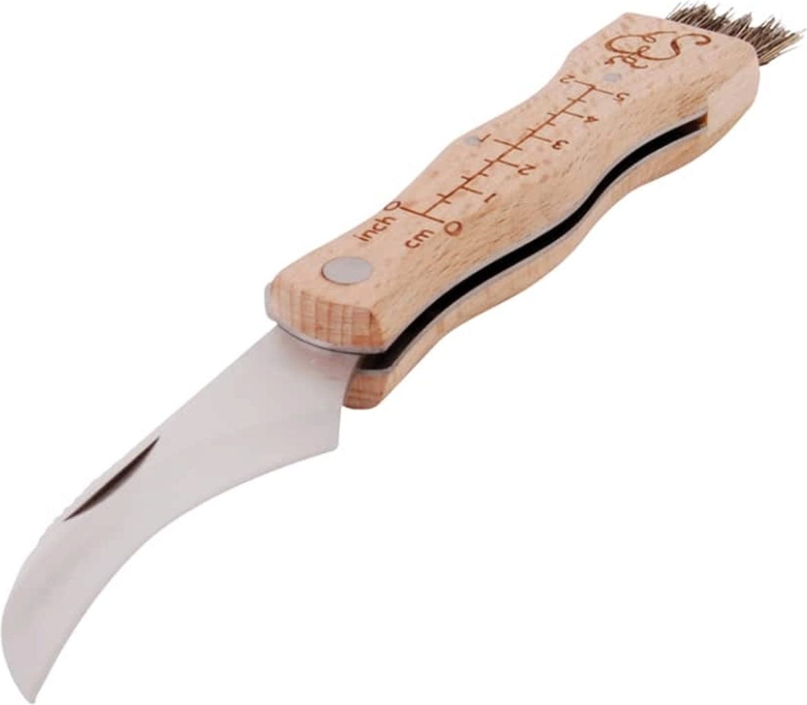- A faca curva de aço inoxidável garante um corte limpo, sem destruir a rede subterrânea do cogumelo.