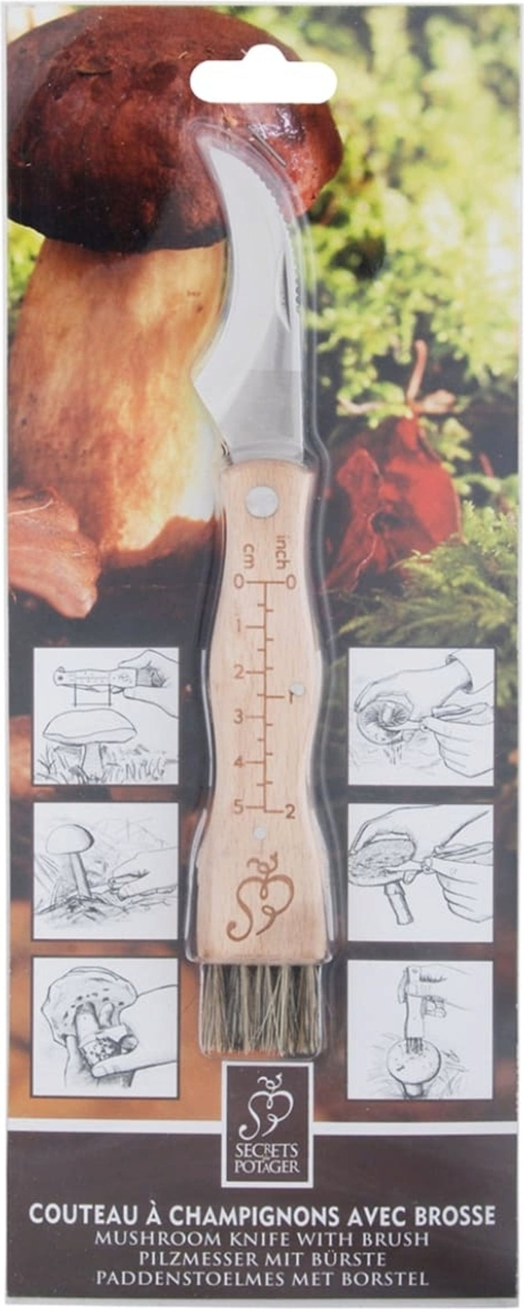 - Com a escala de medição (cm e polegadas) no cabo de madeira de faia, pode determinar posteriormente o tamanho dos cogumelos colhidos.