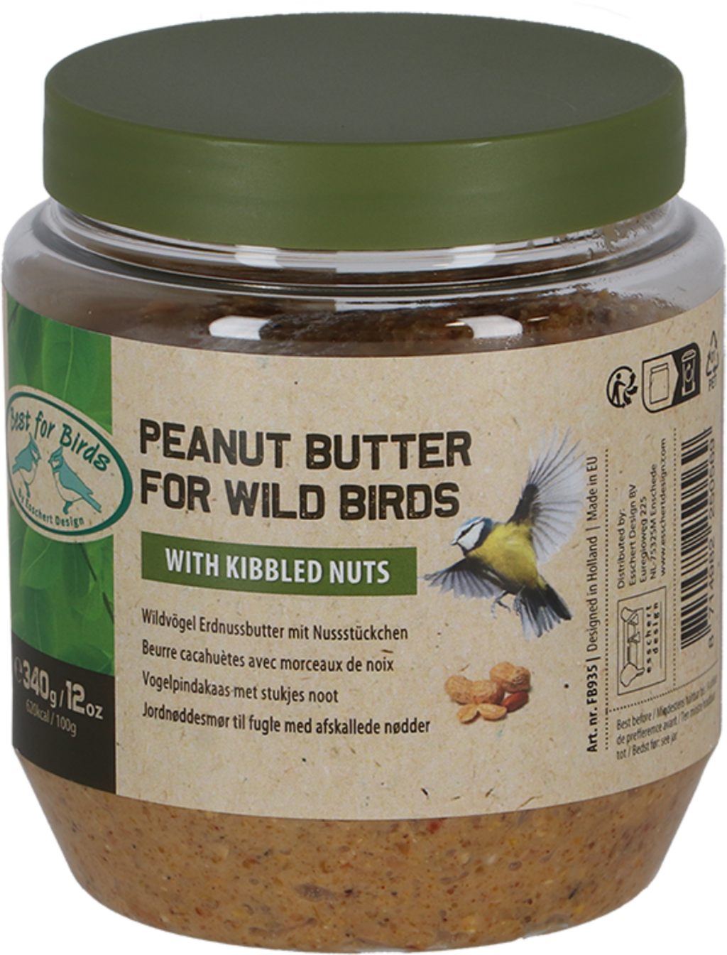 Esta manteiga de amendoim contém pedaços de nozes crocantes e fornece às aves uma grande quantidade de gordura valiosa. Pode ser oferecida durante todo o ano e constitui uma guloseima nutritiva para as diversas espécies de aves no seu jardim.