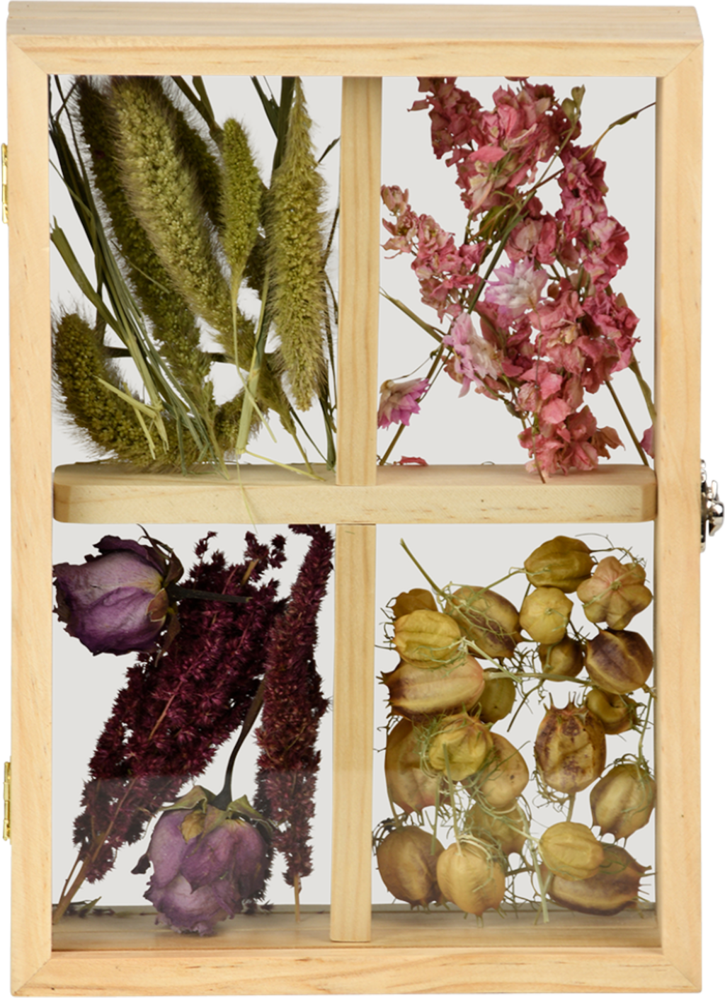 As molduras profundas de dupla face com um aspeto discreto destacam ervas e flores secas de forma inteligente, elegante e eficaz.