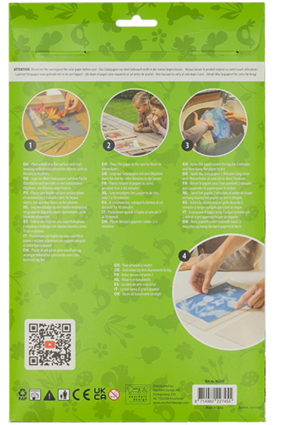 Com este papel solar, pode criar obras de arte muito especiais - e apenas com o poder do sol! O papel reage à radiação UV, permitindo a criação de motivos maravilhosos. Basta procurar algo bonito, como folhas, flores ou penas, e colocá-lo sobre o papel. Após cerca de 10 minutos ao sol, pode remover os objetos. Agora, enxague o papel sob água corrente durante 2 minutos para revelar e fixar o motivo. Depois, pendure-o para secar e desfrute de uma obra de arte verdadeiramente única.