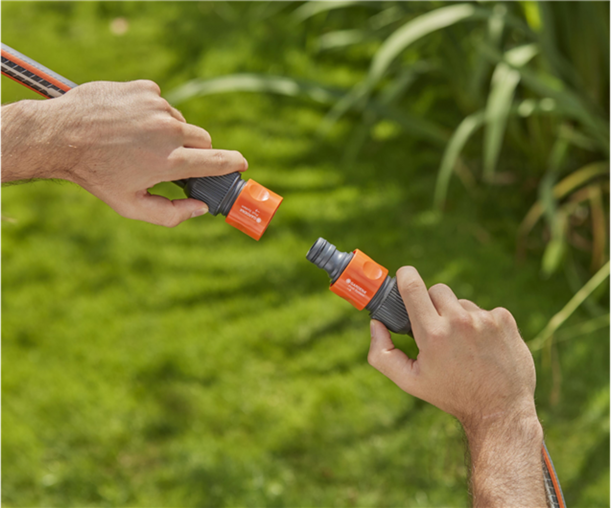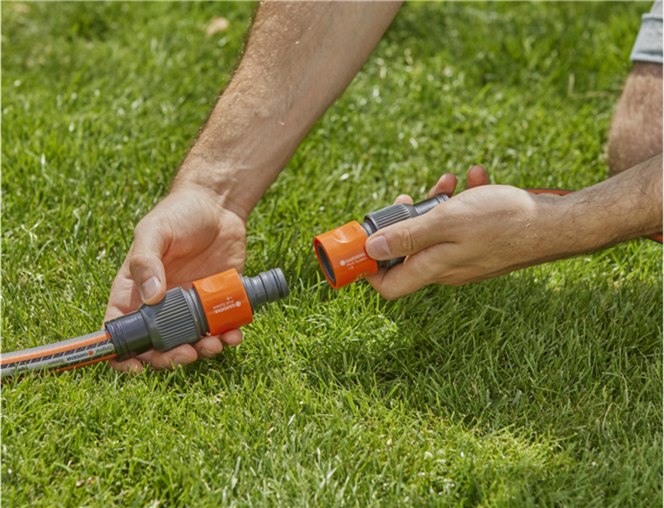 Com o Acoplamento Profi-System da GARDENA, cria uma ligação ideal entre duas mangueiras. Basta encaixar ambas as extremidades da mangueira e já está!