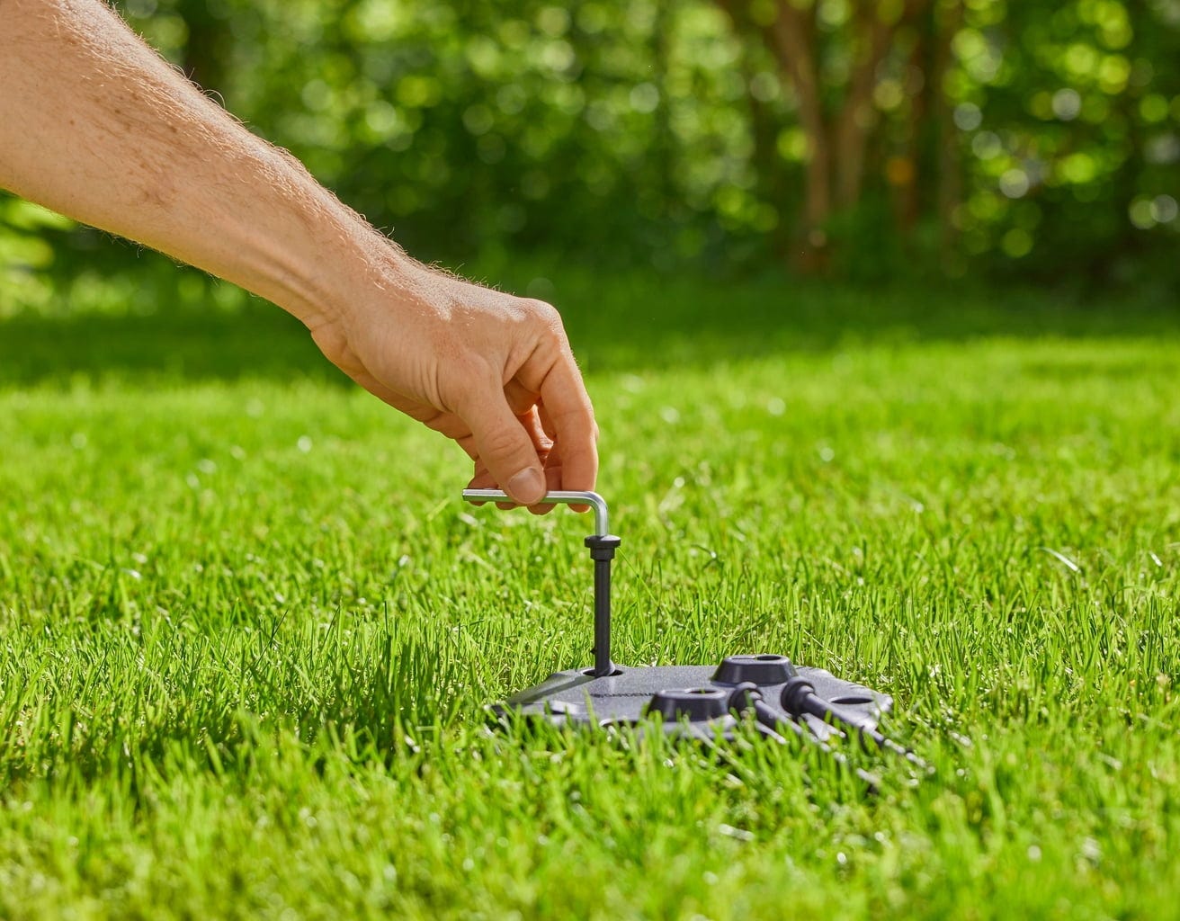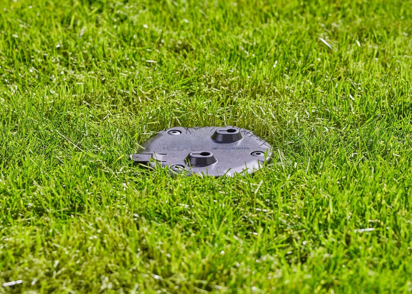 A AquaPrecise Docking Plate é instalada acima do solo, mas é tão plana que não interfere ao cortar a relva. O sistema de irrigação AquaPrecise pode ser posicionado com precisão utilizando a placa, garantindo uma rega exata.