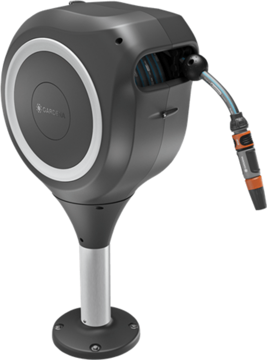 A caixa está equipada com uma mangueira de jardim integrada de 15 m de comprimento e pode ser posicionada de forma flexível graças à rotação de 360°, sem dobrar a mangueira. Graças à tecnologia RollUp, pode desenrolar a mangueira sem esforço e voltar a enrolá-la confortavelmente e sem emaranhados após a utilização.