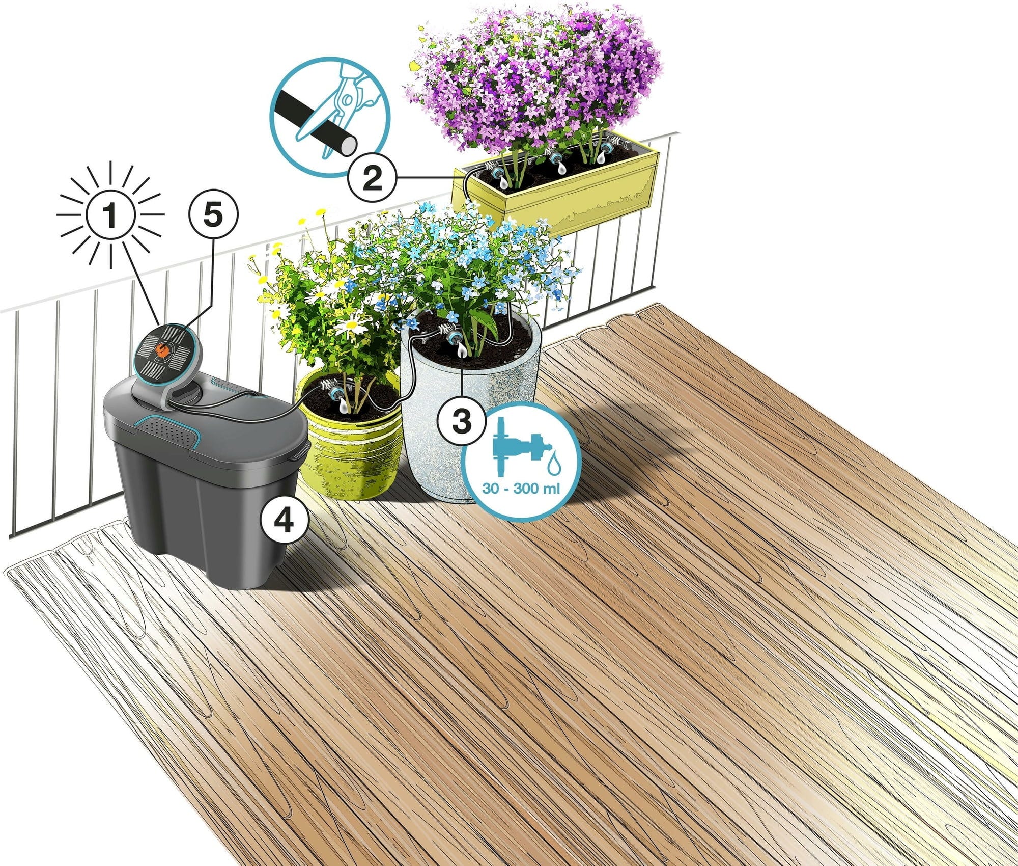 - Fornece água a até 20 plantas de varanda e terraço