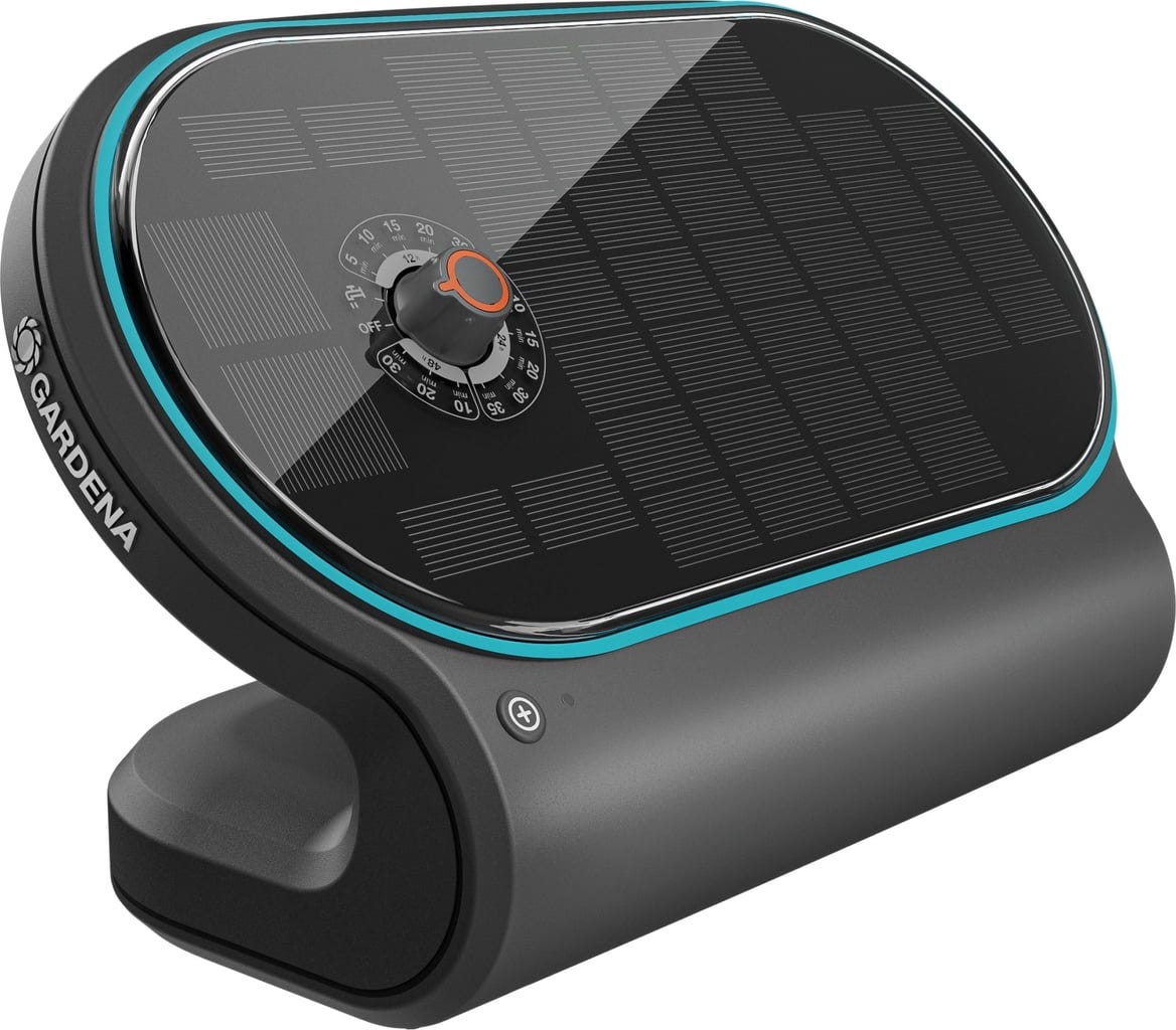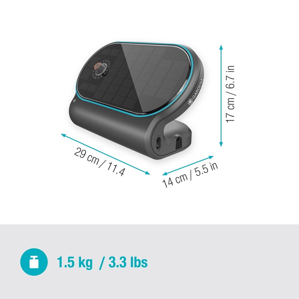 Conteúdo da embalagem: 1 x unidade de controlo GARDENA com bomba integrada, painel solar e bateria de iões de lítio, 20 x gotejadores em linha autocompensados de 2 l/h, 10 x gotejadores em linha autocompensados de 0,5 l/h, 20 x suportes de tubo 4,6 mm (3⁄16"), 10 x peças em T 4,6 mm (3⁄16"), 13 x peças em L 4,6 mm (3⁄16"), 2 x tampões de fecho 4,6 mm (3⁄16"), 1 x filtro, 20 m de tubo de distribuição 4,6 mm (3⁄16")