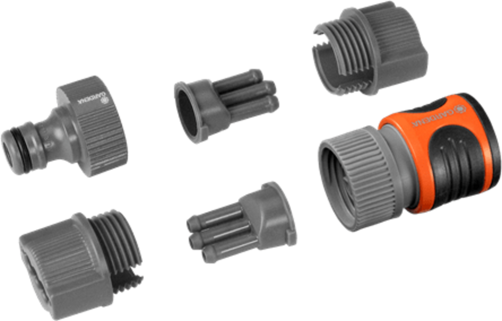 Este conjunto de ligação para mangueira de aspersão contém todas as peças de sistema originais GARDENA de que necessita para a ligação à mangueira de aspersão GARDENA.