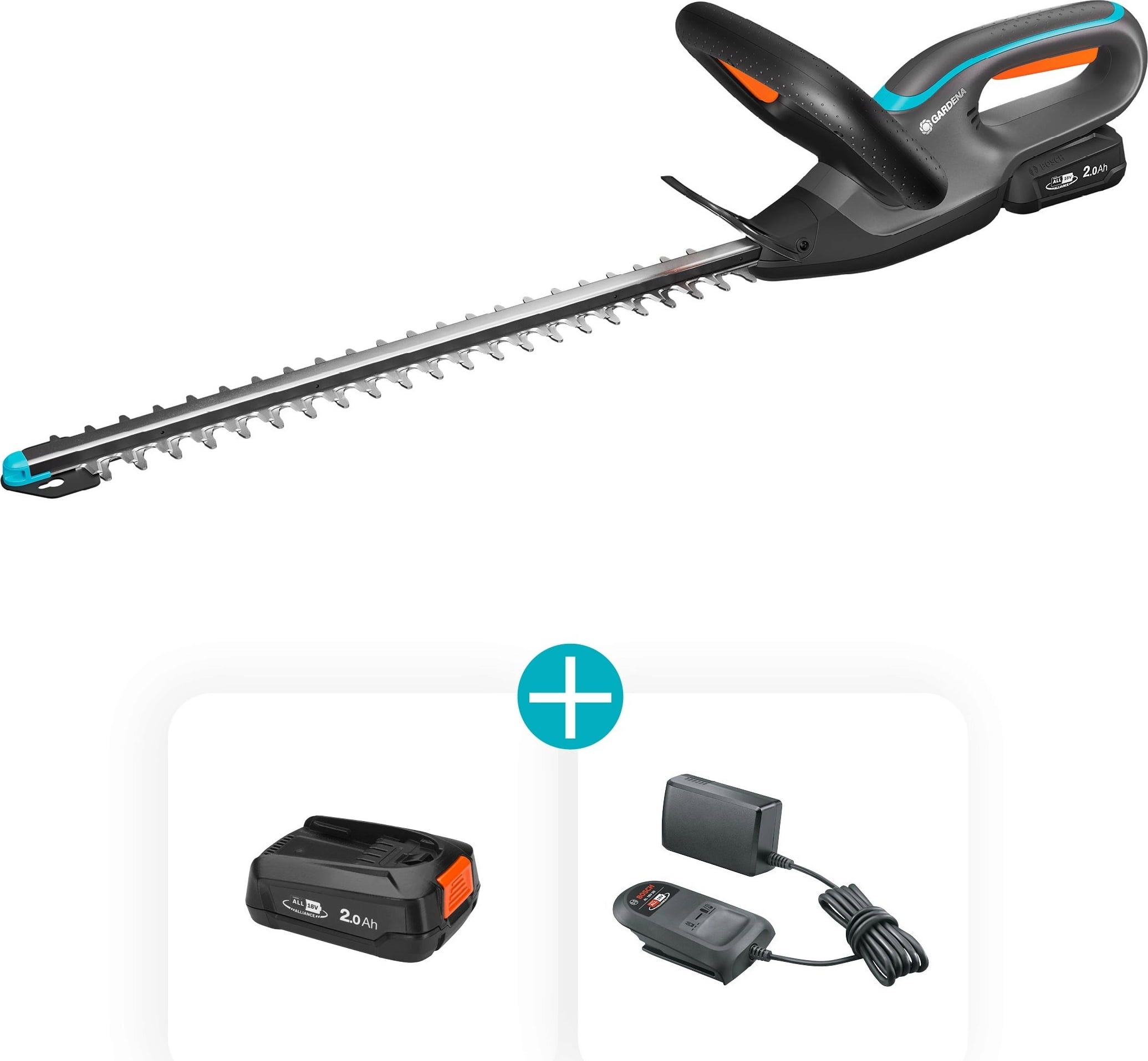 Conteúdo da embalagem: corta-sebes EasyCut 45/18 V P4A, bateria de 2,0 Ah, carregador
