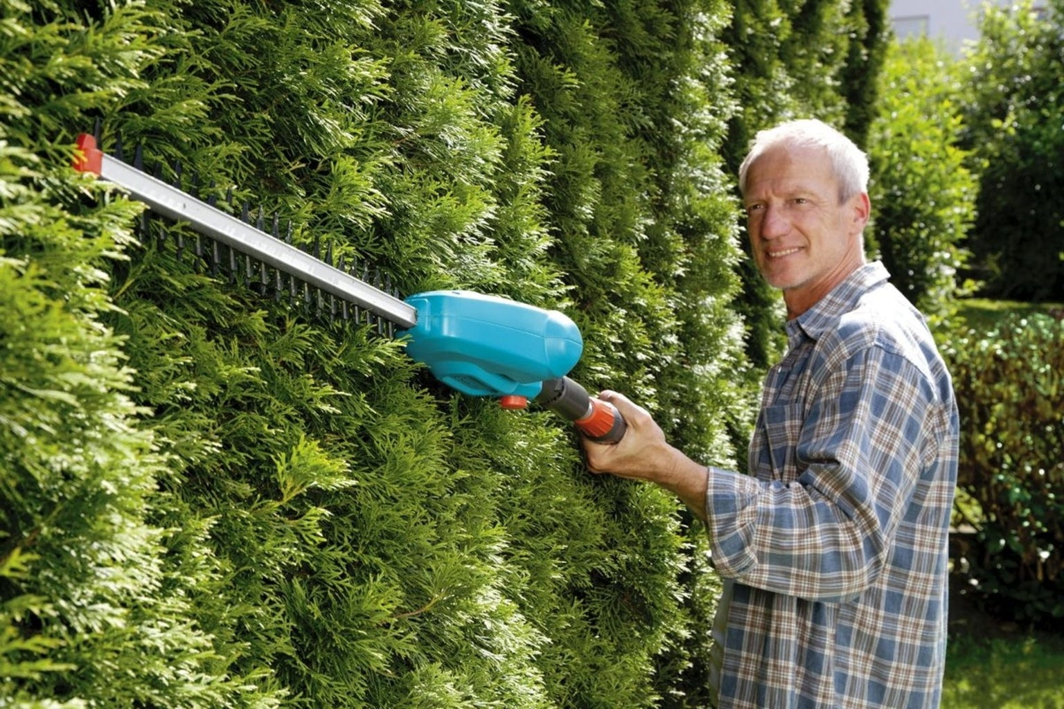 - Para colocar a lâmina na posição de corte correta, a cabeça de corte pode ser facilmente inclinada - permitindo cortar o topo da sebe de forma confortável e precisa