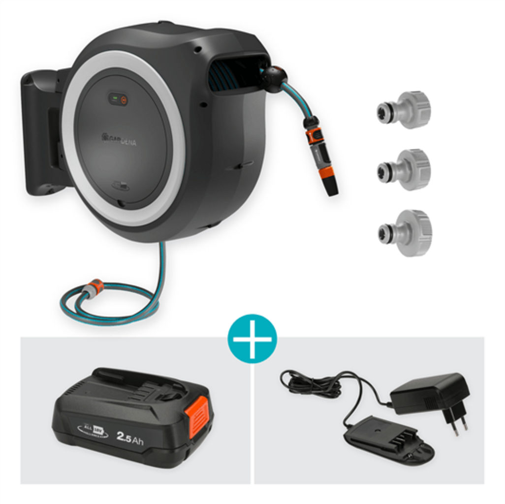Descobrir uma forma mais cómoda de regar o jardim com o enrolador de mangueira de parede PowerRoll XXL da GARDENA alimentado a bateria. O Set Ready-to-Use inclui tudo o necessário para começar de imediato.