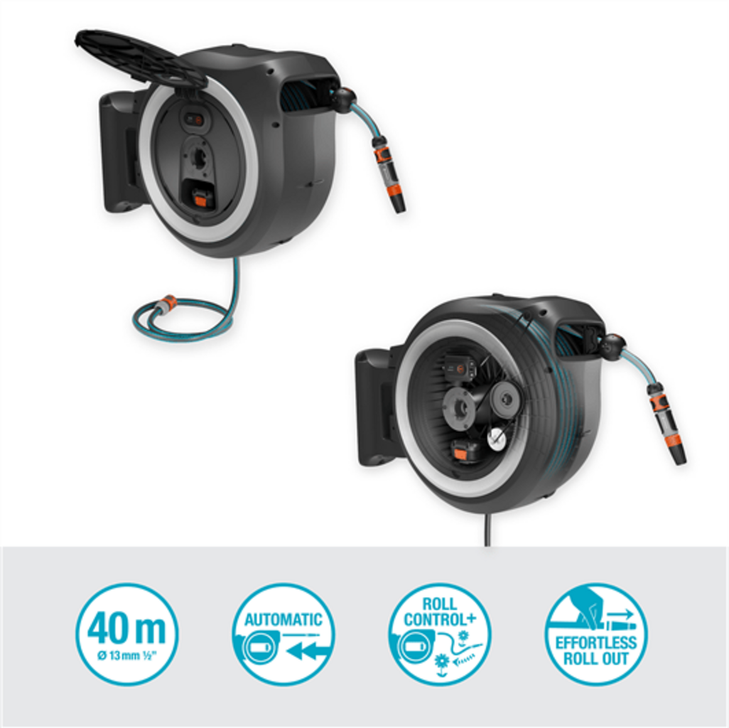 - Rebobinamento suave: graças à função RollControl+ e ao guia de mangueira integrado, o enrolamento ocorre de forma uniforme, sem dobras ou nós. A velocidade é reduzida automaticamente nos últimos 2 metros para evitar possíveis danos.