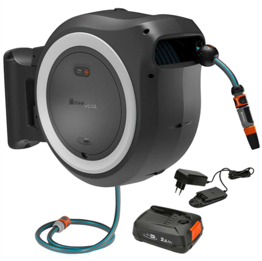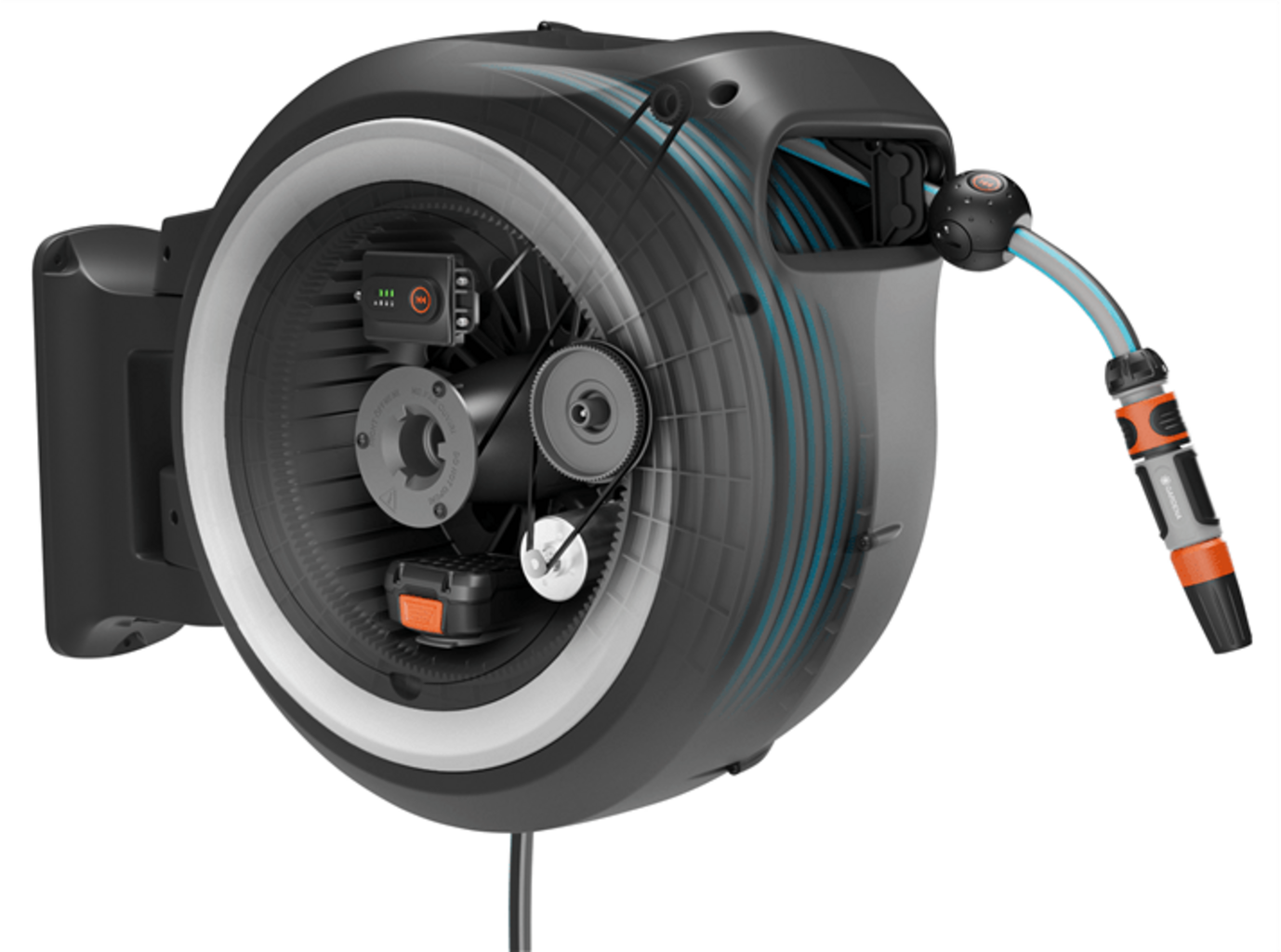 - Ideal para jardins de grandes dimensões: a mangueira de 40 m permite alcançar facilmente todas as áreas do jardim e está equipada com comando na extremidade que ativa a função de rebobinamento a bateria.