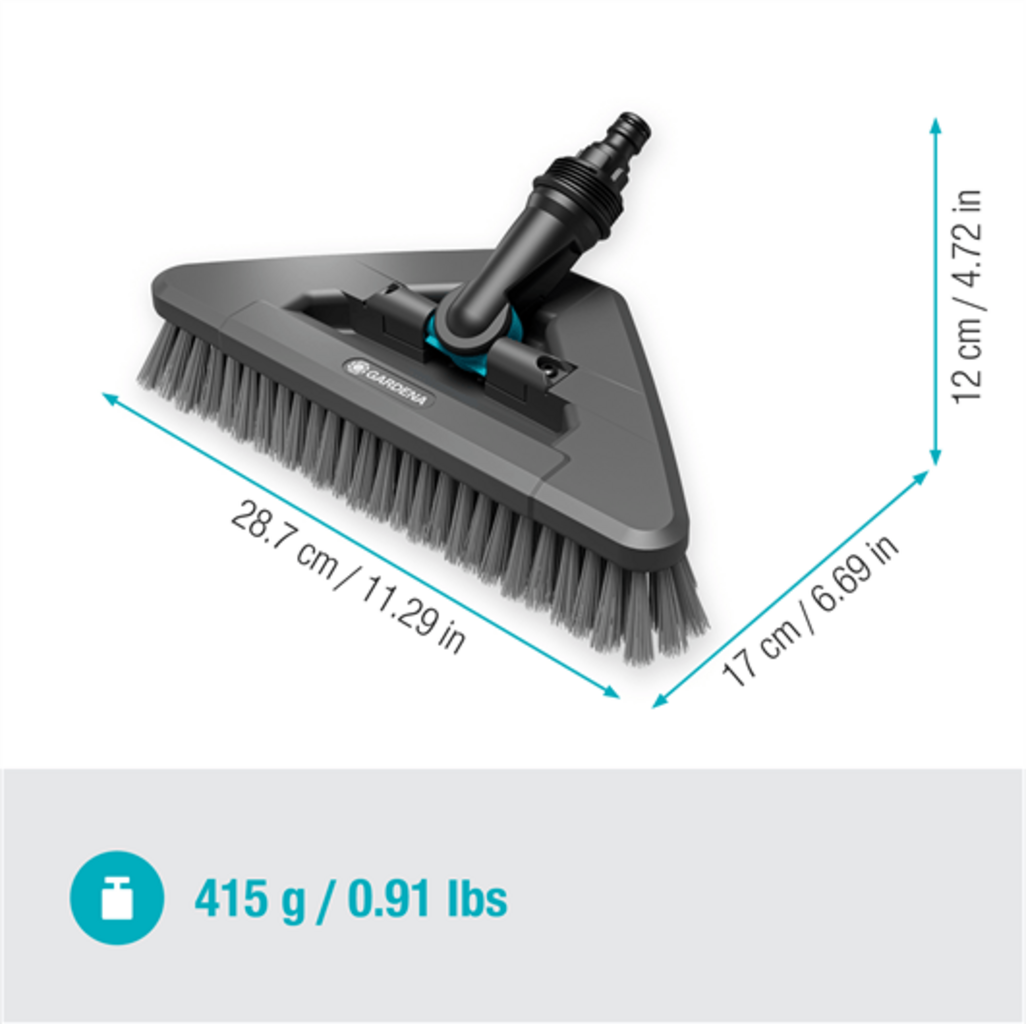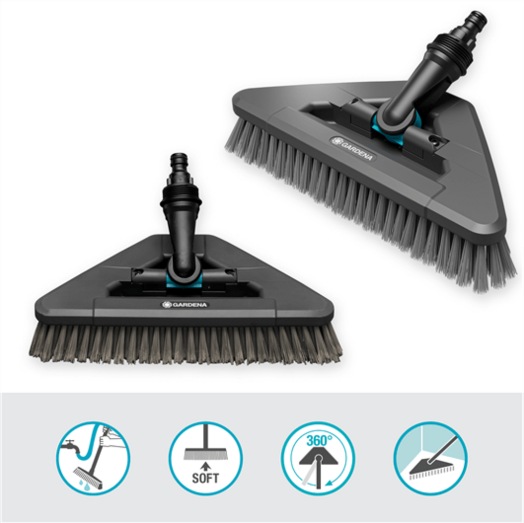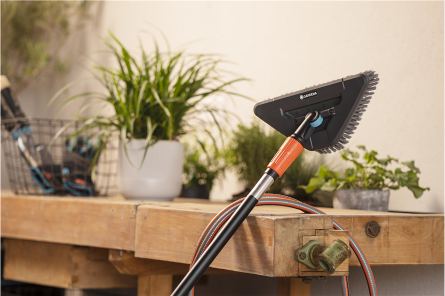 A GARDENA Cleansystem Escova com cabo soft flex é perfeitamente adequada para a limpeza de superfícies exteriores maiores e sensíveis. Em combinação com um cabo Cleansystem, pode ser facilmente ligada a uma mangueira de jardim e garante uma limpeza radiante sem riscos ou danos. Mesmo os locais de difícil acesso, como é frequentemente o caso das pérgulas, podem ser limpos de forma eficaz com a prática forma triangular. A escova macia remove de forma fiável o pó, a sujidade e os depósitos sem deixar marcas.