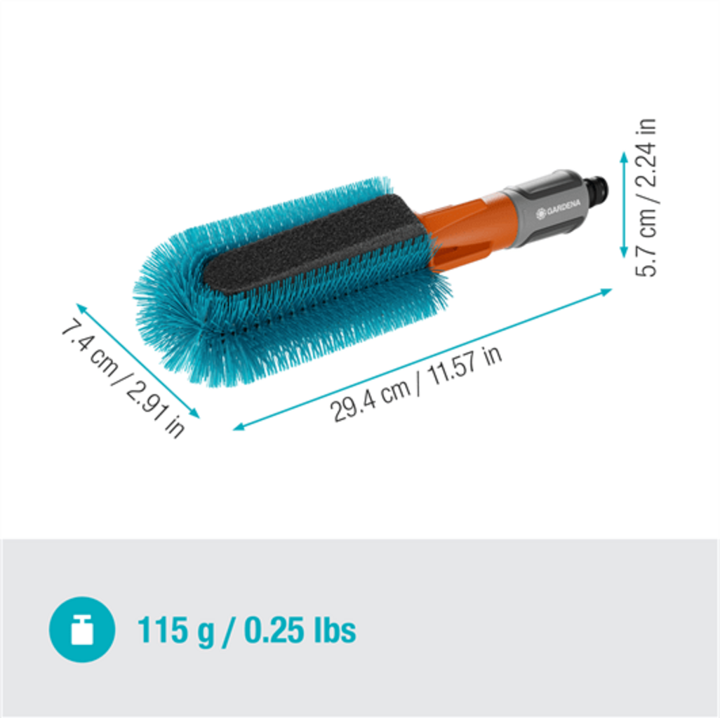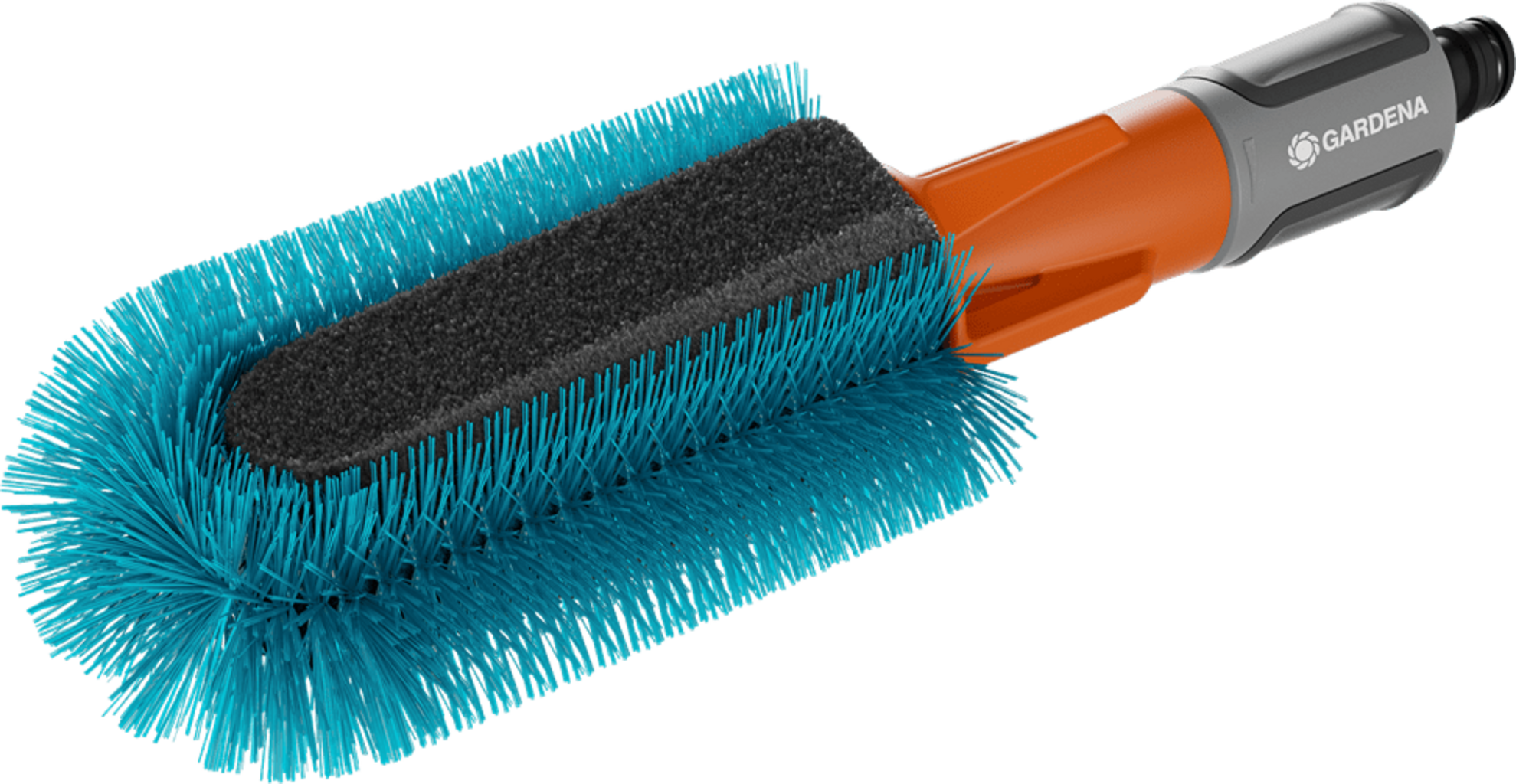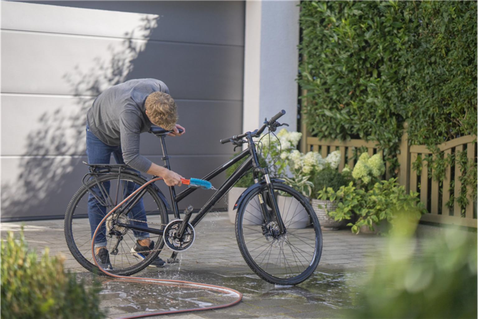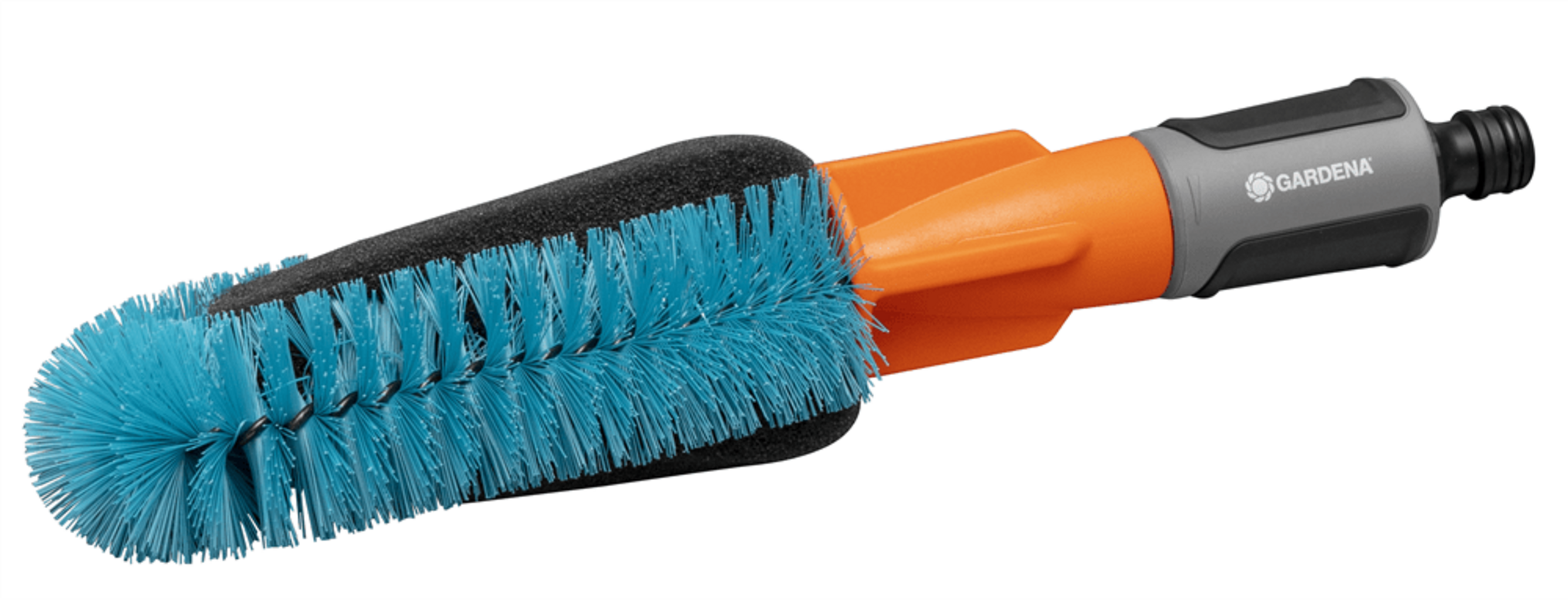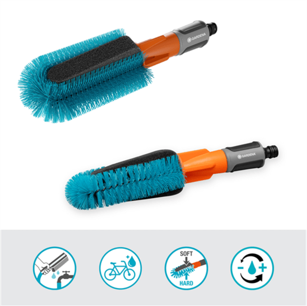 Esta prática escova para bicicletas GARDENA Cleansystem simplifica todas as tarefas envolvidas na limpeza de bicicletas, atrelados ou carrinhos de bebé. As cerdas robustas tratam da sujidade persistente, enquanto a esponja suave limpa superfícies delicadas. Graças ao fluxo de água infinitamente ajustável no cabo da escova, poupa-se a maçadora ida à torneira. Isto torna a limpeza ainda mais fácil e eficiente.
