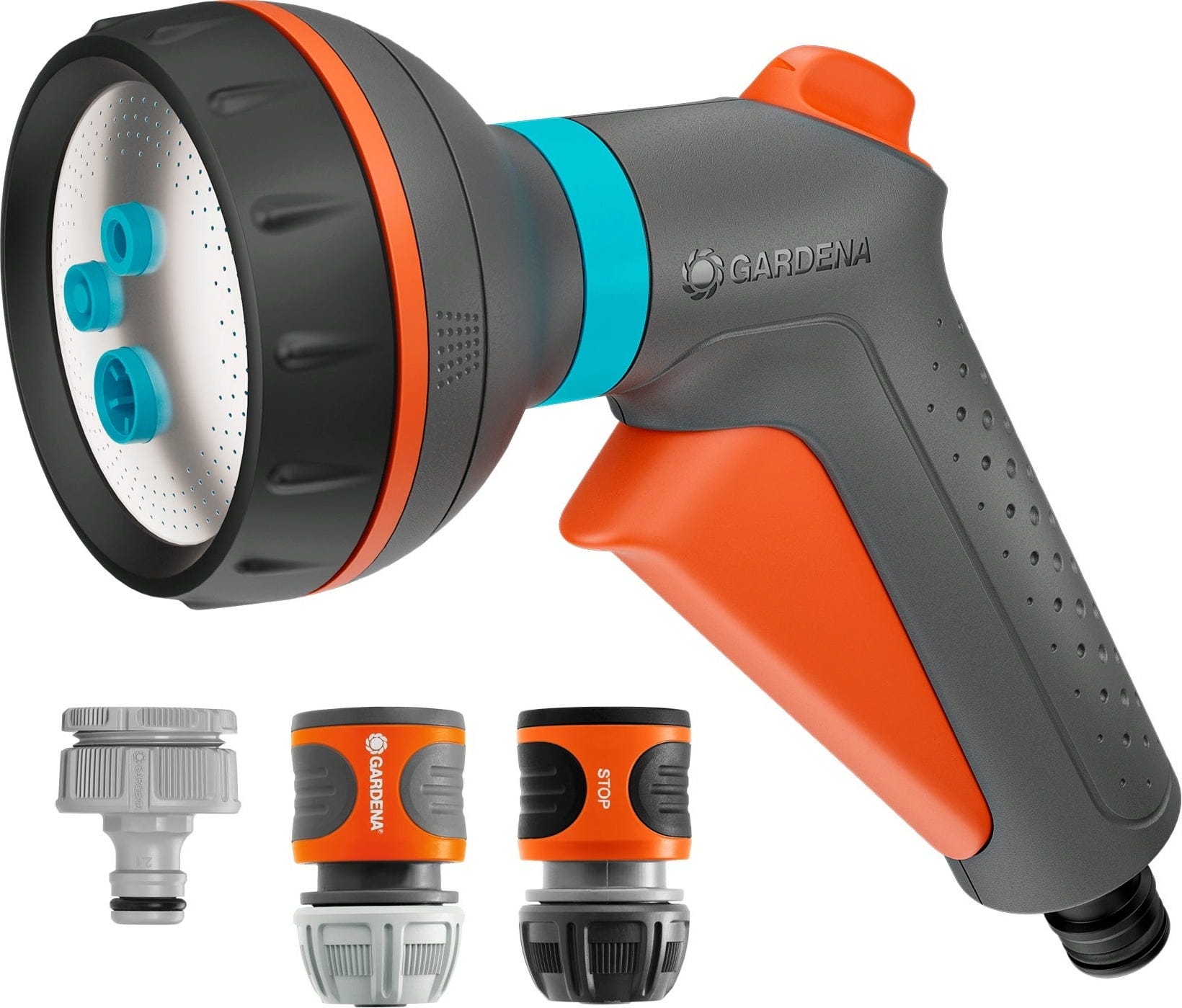 Com este kit de lança multifunções da GARDENA, tudo fica preparado para qualquer necessidade de rega. A lança multifunções oferece quatro tipos de jato, desde a nebulização fina para rebentos jovens, passando pelo jato suave para canteiros, até ao jato pleno potente para vasos ou trabalhos de limpeza.