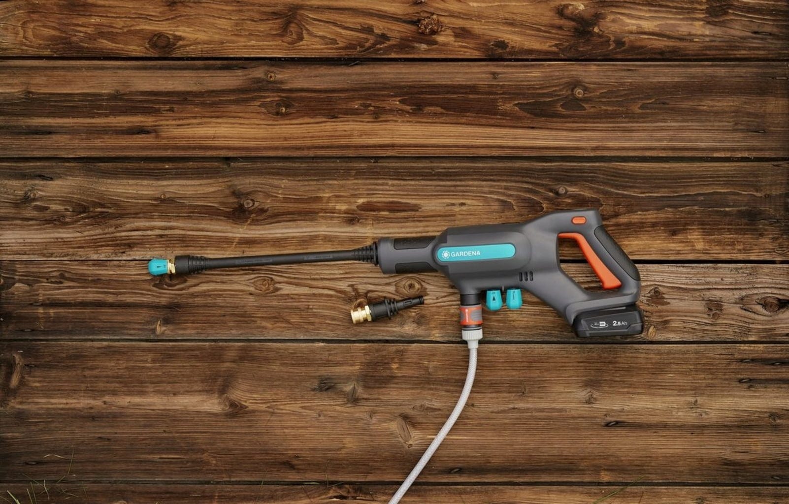 O "Ready-to-use-Set" pronto a usar contém diversos acessórios para a máxima flexibilidade, além de estar imediatamente pronto a ser utilizado independentemente de uma fonte de alimentação. Também não é necessária uma ligação de água fixa. Um recipiente com água ou uma fonte de água alternativa, como um barril de chuva, é suficiente. Genial.