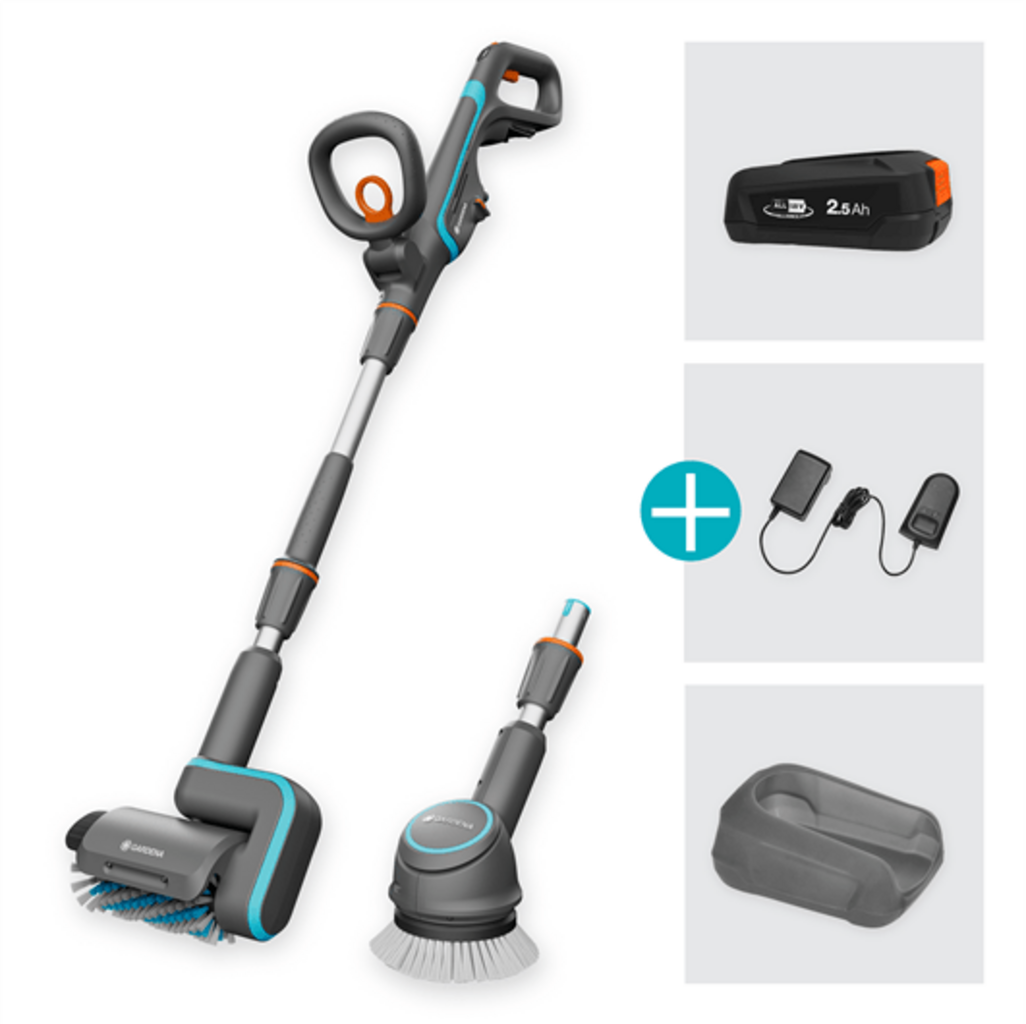 Descubra o GARDENA Akku-Multi-Reiniger AquaBrush Universal Ready-To-Use Set – a solução definitiva para a limpeza exterior.