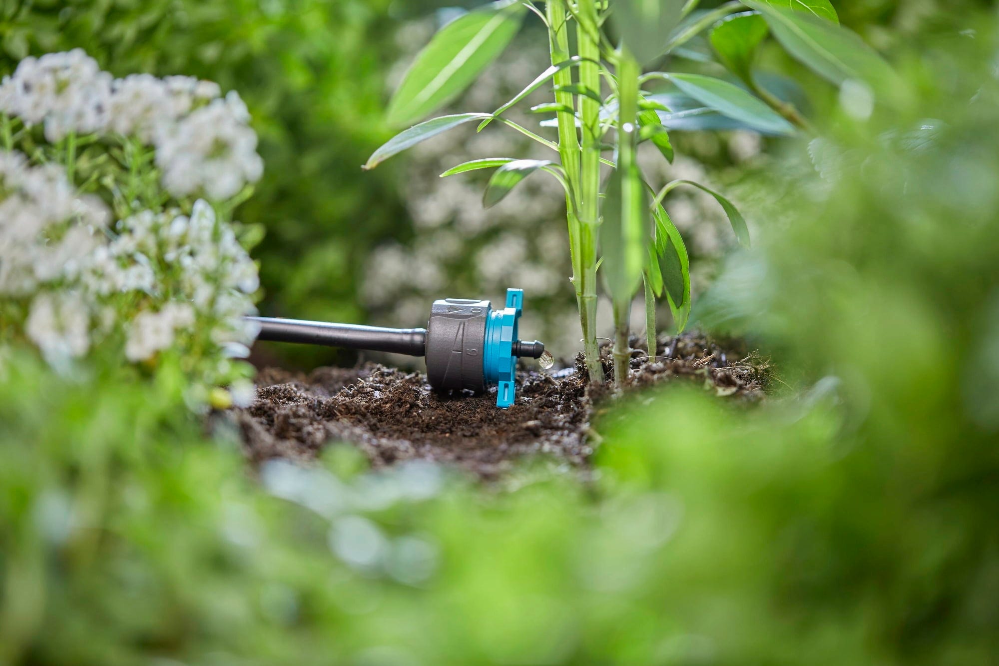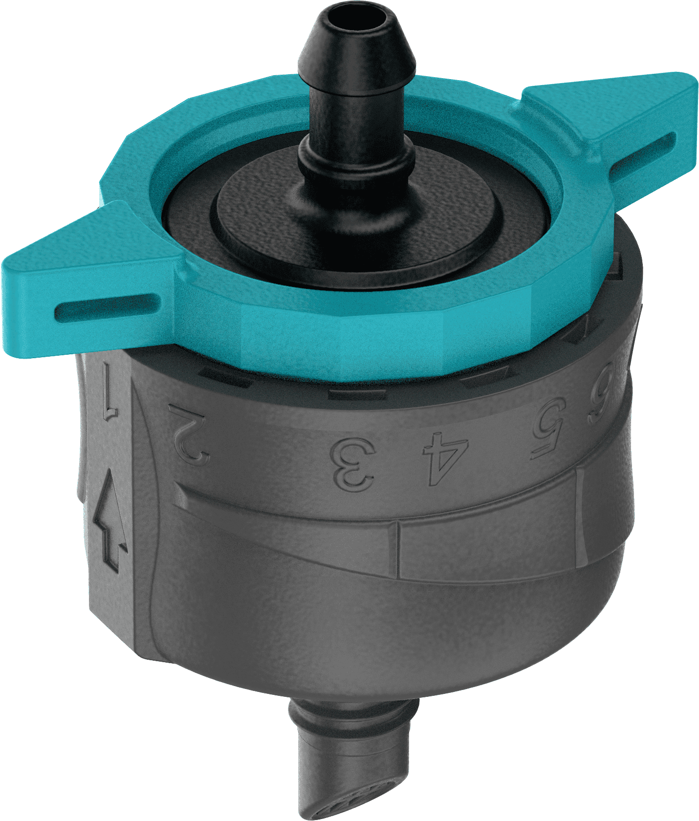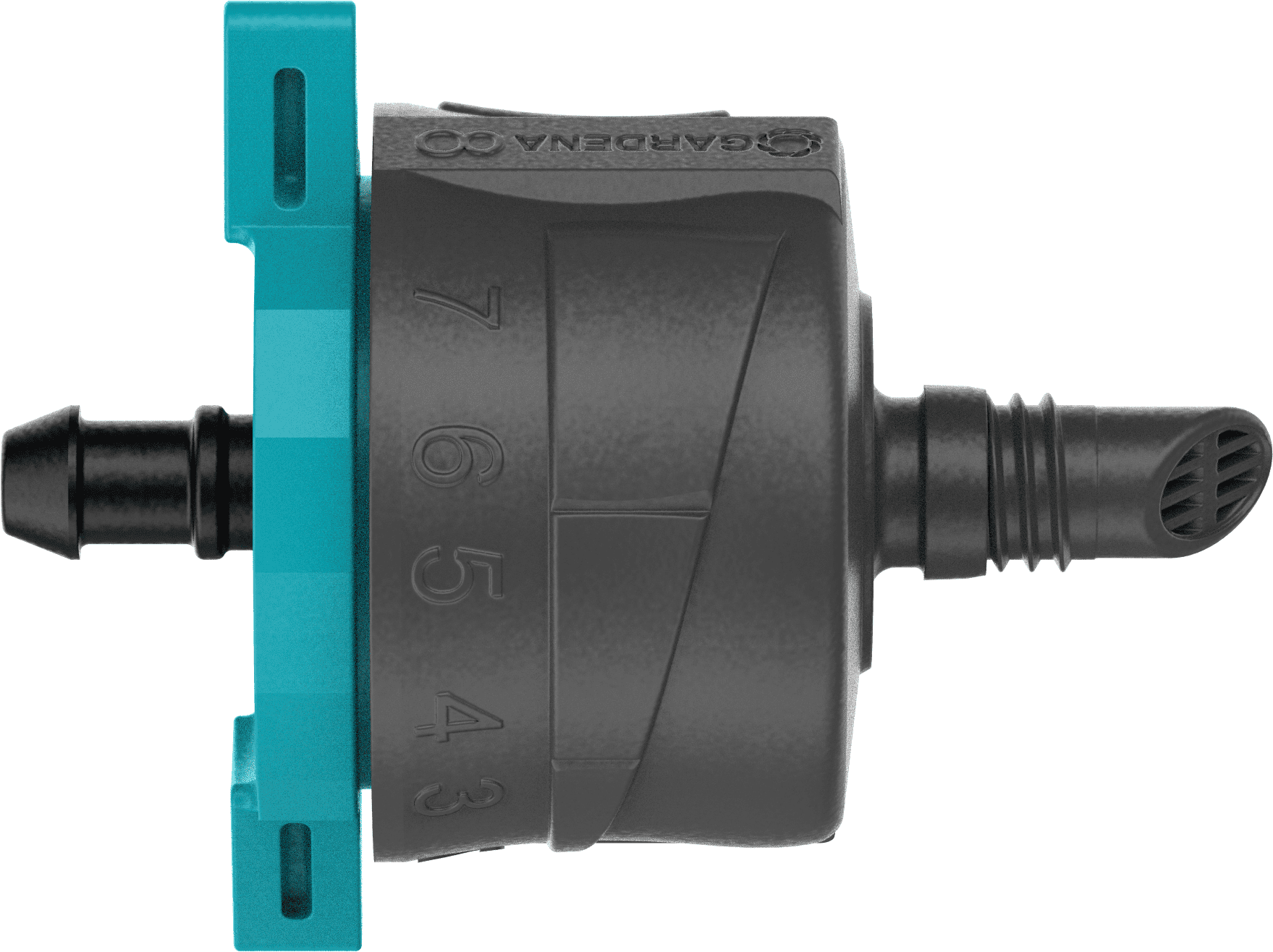 O gotejador final regulável e autocompensado é adequado para a irrigação de plantas individuais e fileiras de plantas, no âmbito do GARDENA Micro-Drip-System. Com a ajuda da escala no gotejador, a quantidade de água necessária pode ser ajustada. Desta forma, pode ser feita uma distribuição de 1 a 8 litros por hora.